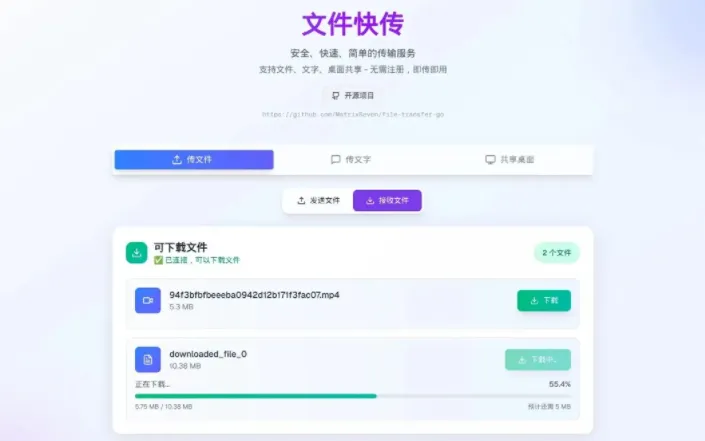 file-transfer-go 是一个基于 Go 和 React 开发的端到端 WebRTC 文件传输系统,支持文件、文字和桌面共享,所有数据通过 P2P 直连传输,不经过服务器,保障隐私安全。