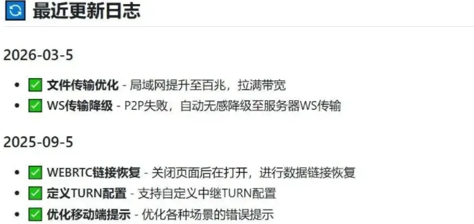 前几天还更新了,它其实有点像一个轻量级的局域网协作工具。如果你经常需要在电脑之间传大文件,用它会比传统方式方便很多。