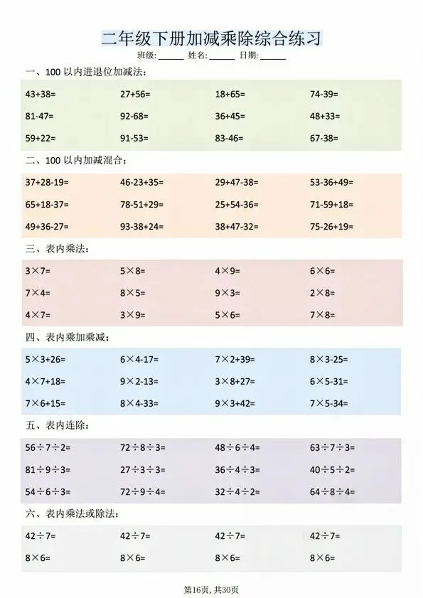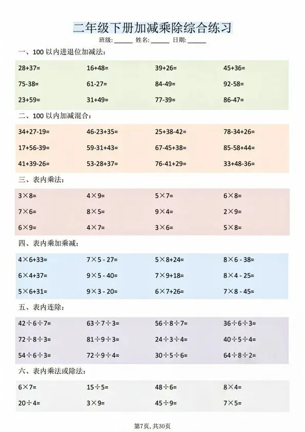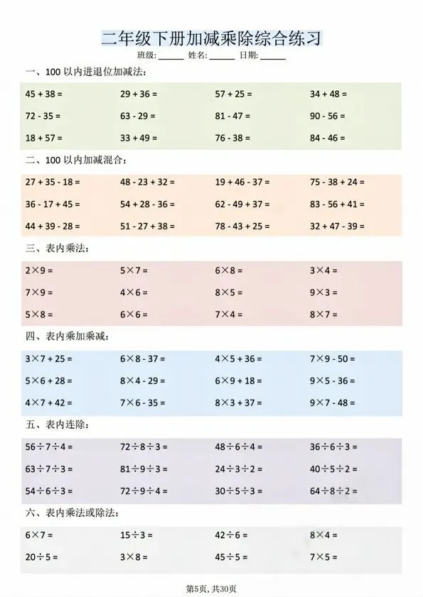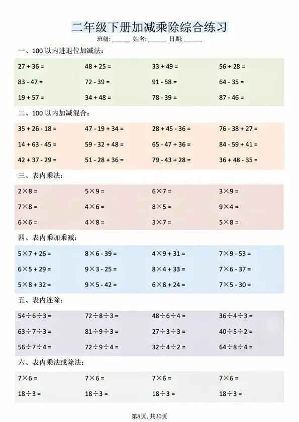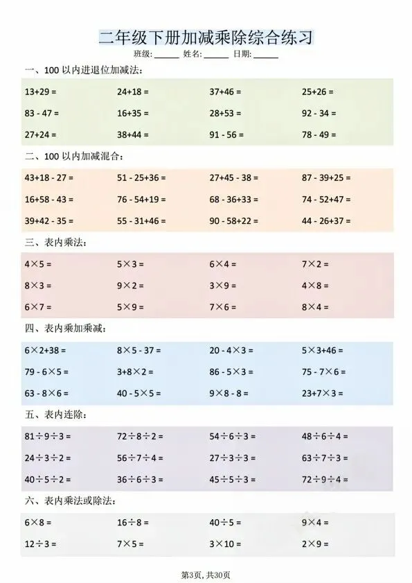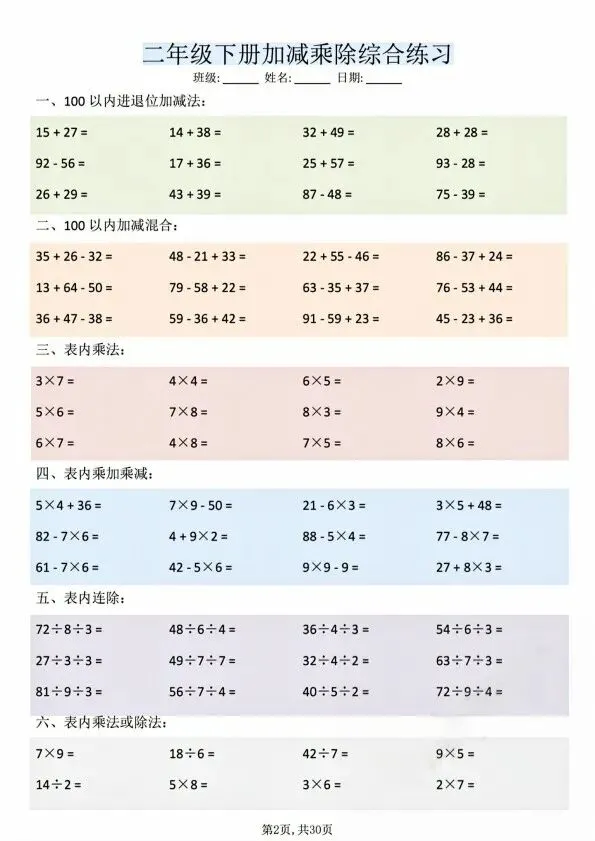今日分享二年级下册数学加减乘除综合练习(完整电子版可打印)!高清电子版可直接打印,排版规整适配练习,不用费心整理,孩子每日一练夯实基础,家长辅导省心!