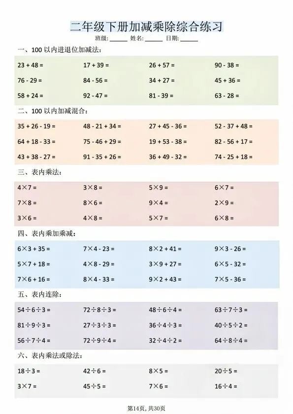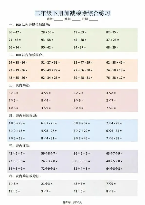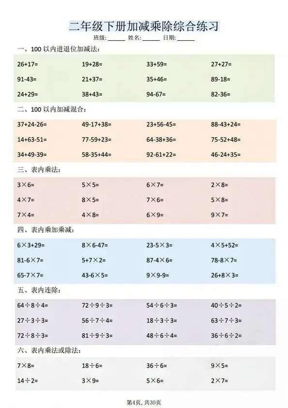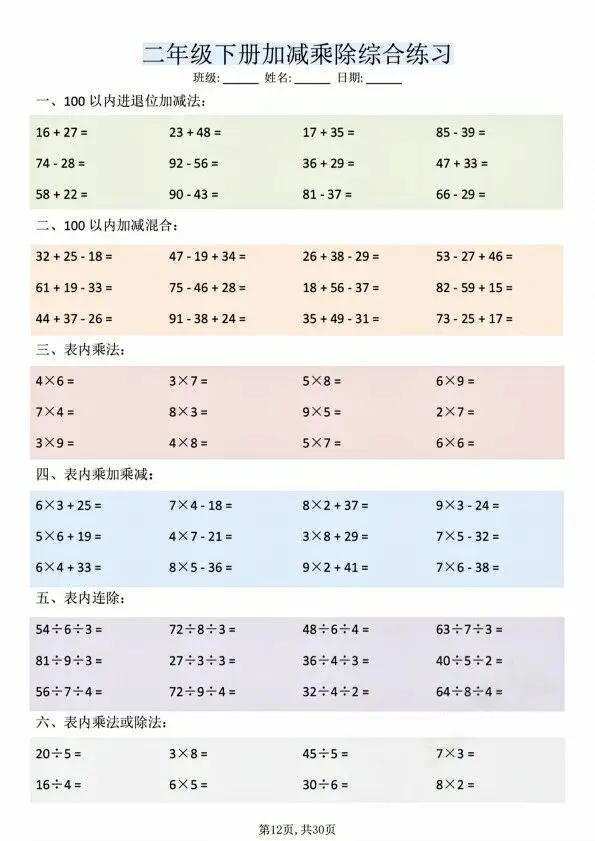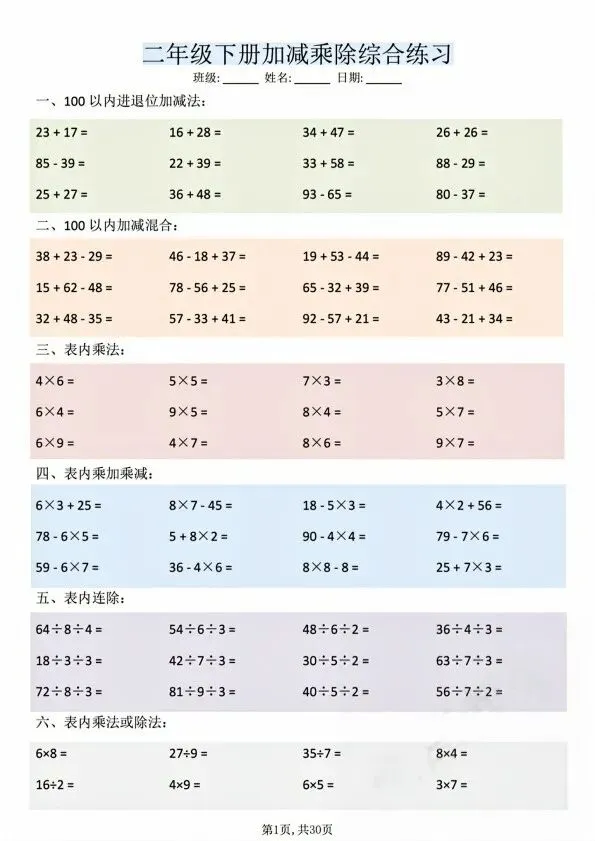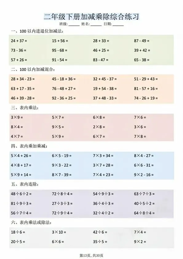 今日分享二年级下册数学加减乘除综合练习(完整电子版可打印)!高清电子版可直接打印,排版规整适配练习,不用费心整理,孩子每日一练夯实基础,家长辅导省心!