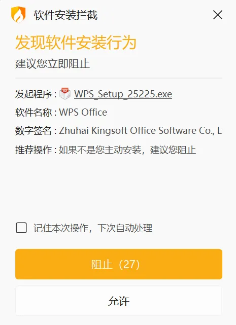 安装时弹出“软件安装拦截”窗口,这是安全软件在保护你。如果你是自己主动安装的,点“允许”就行。