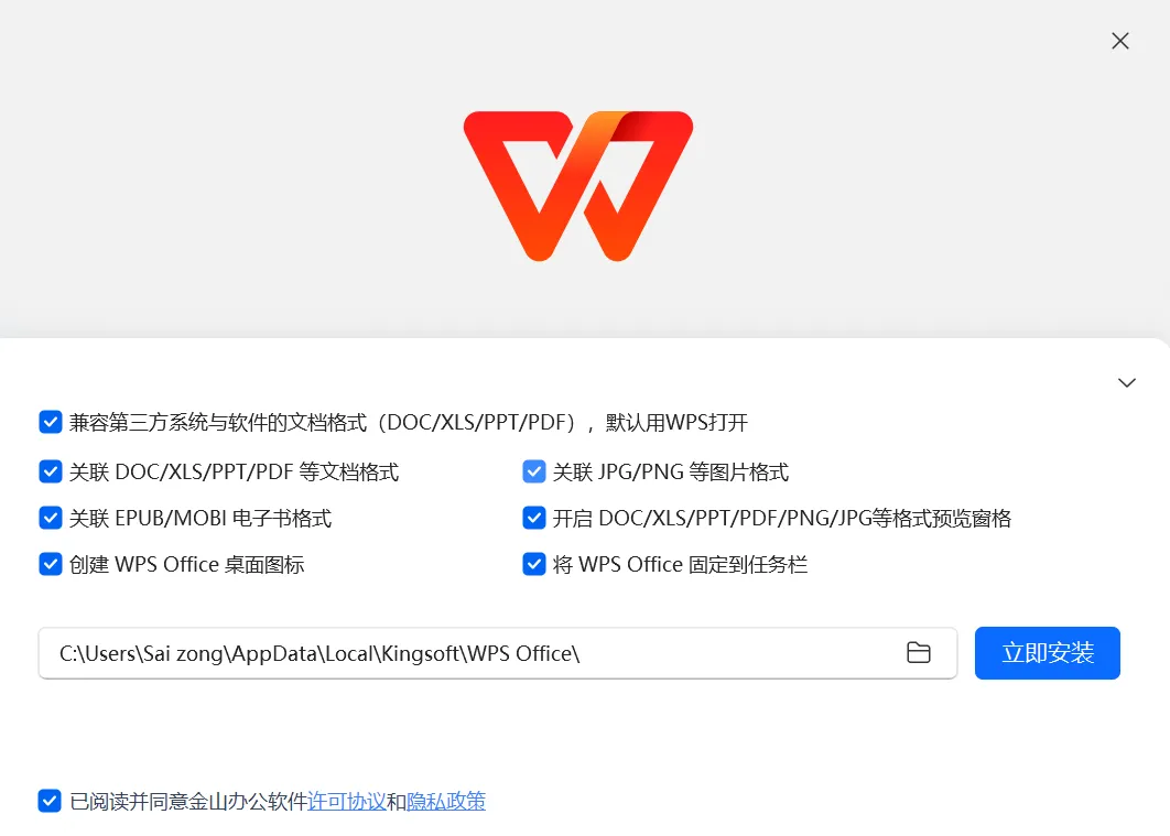 这些都可以不勾。你只是想要个写字的软件,不是来开超市的。我只建议保留“创建 WPS Office 桌面图标”这一项。