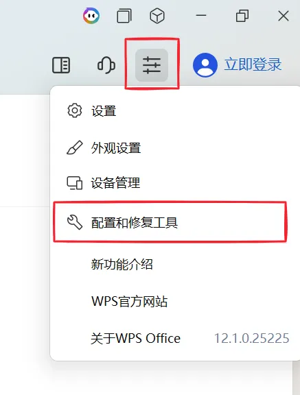第一,进配置工具。 点击右上角的“设置”图标(齿轮形状),选择“配置和修复工具”。