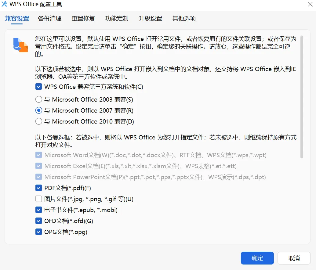 这里控制WPS默认打开哪些文件类型。建议只保留你常用的: