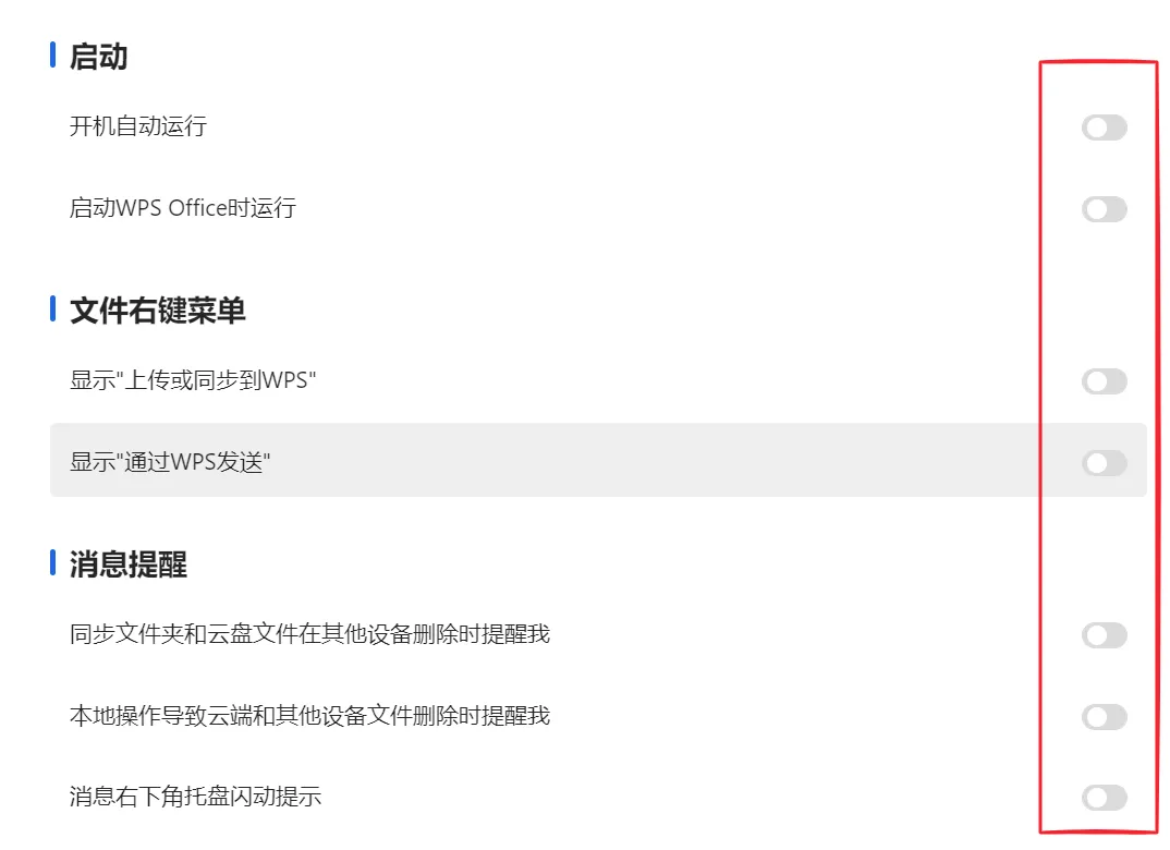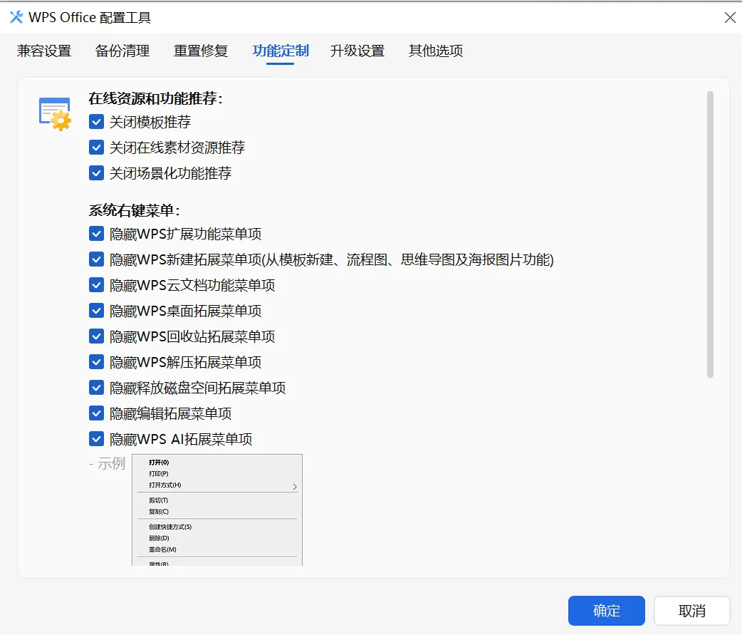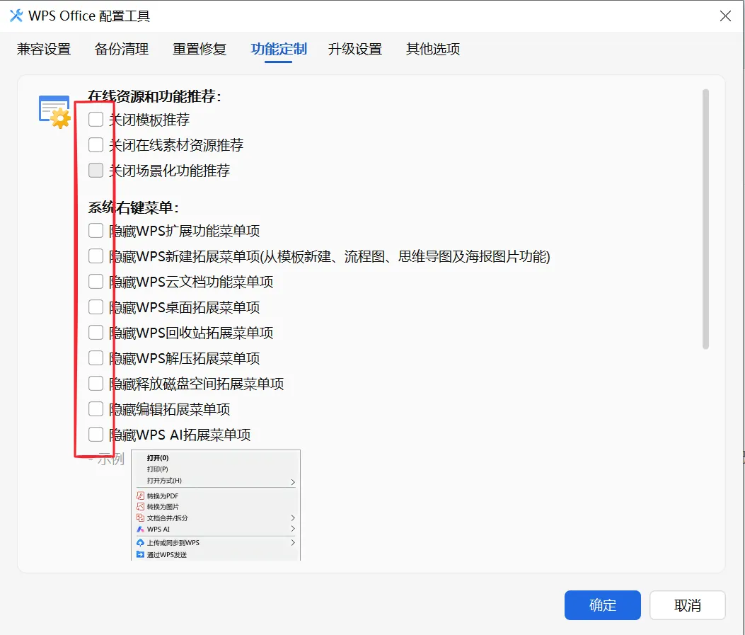 在线资源和功能推荐:全勾上。关闭模板推荐、关闭在线素材资源推荐、关闭场景化功能推荐——这样WPS就不会老弹广告了。