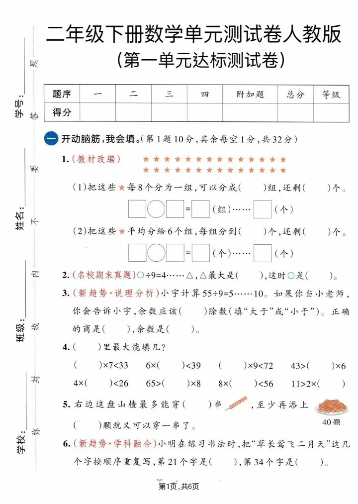 今日分享二年级下册数学第一单元测试卷,完整电子版,可直接下载打印。文末有完整电子版领取方式。