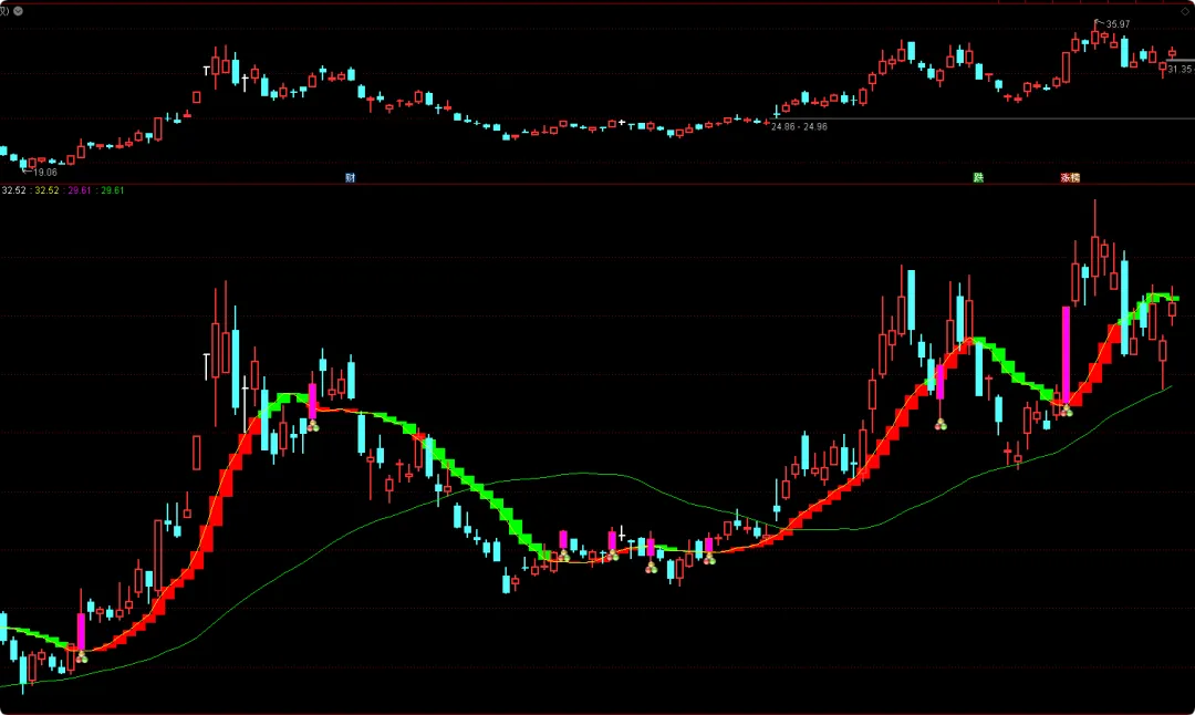 STICKLINE(CLOSE< MA(CLOSE,DZQ),MA(CLOSE,DZQ),REF(MA(CLOSE,DZQ),1),5,0),COLOR00FF00;