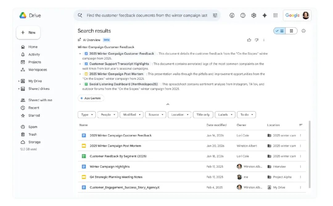 谷歌还宣布,将让云端硬盘(Drive)不再只是一个文件存储工具,而是升级为更主动的协作助手。现在,当你在云端硬盘中使用自然语言搜索时,Gemini 会在搜索结果顶部生成一份 “AI 概览”,类似于谷歌搜索中的展示形式。该概览会从你的文件中提取最相关的信息并注明来源,你无需打开文档即可找到所需内容。