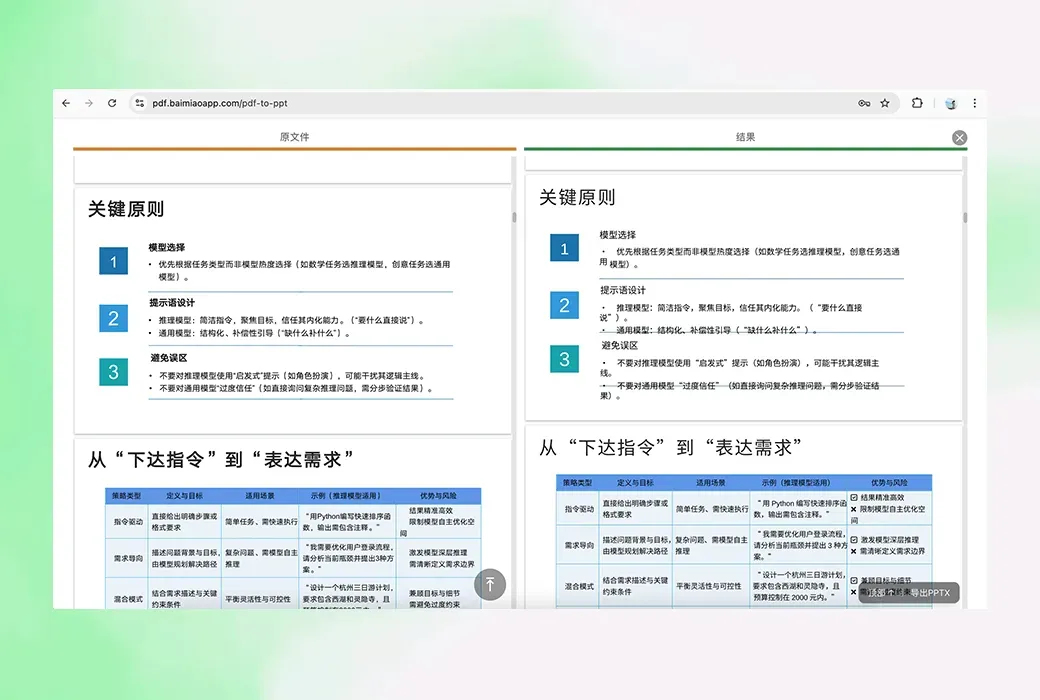 PDF 全方位转换:不仅仅是转 Word。一键即可将 PDF 转换为可编辑的 PPT 演示文稿用于汇报,或转换为清爽的 Markdown 格式用于代码文档与博客写作,更支持转换为Excel,精准提取表格数据。