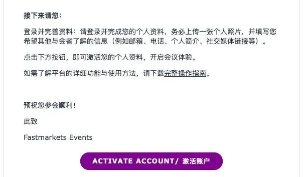 a. 以2026上海电池材料会议为例,如果您已经成功购票,并收到系统发送的成功注册确认函,那在会议开启前的2周,您将收到另一封来自Swapcard 的中英双语邮件通知,请根据提示,点击”Activate Account/ 激活账户”
