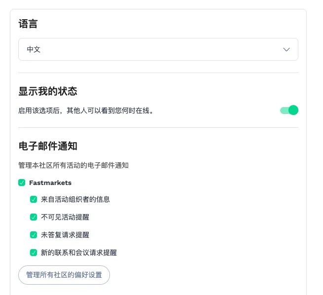 3. 界面语言切换如果您参加的会议所在地为中国,会务组的小伙伴已经为你帮语言障碍全部跑通了。您可以在设置中轻松切换为简体中文,无障碍使用所有功能,包括查看中文议程、演讲嘉宾等全部会议信息。