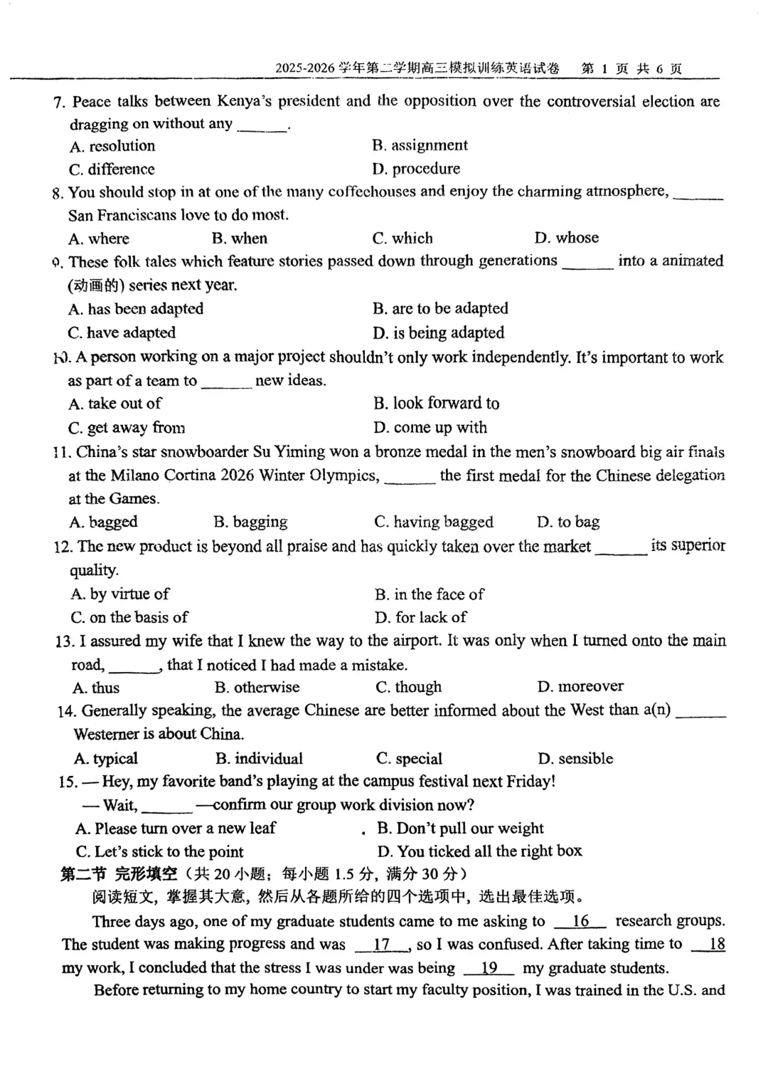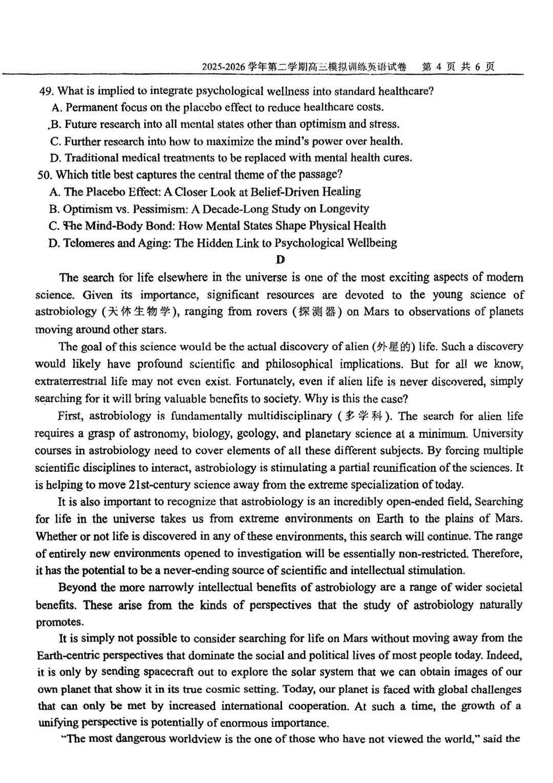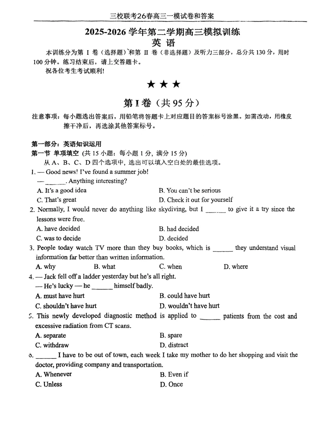 本文最后更新于2026-03-11,某些文章具有时效性,若有错误或已失效,请在下方留言或联系老夜。 【可打印】天津市(一中耀华实验)三校联考2025-2026学年第二学期高三模拟训练(一模)英语试题 点击上方“蓝字”免费关注! 本套试卷+答案下载入口 关注“卿卿侃古今”公众号 点击左下角阅读原文可下载 相关链接: 2007-2025年天津市高考英语真题汇总(持续更新中~) 2011-2023年天津高考英语听力真题在线测试 【高考英语听力在线测试】高考听力机考模拟试题大全(持续更新中) 【可下载】2025-2026年高中英语试题汇总(附解析)【持续更新中】 【汇总】高中英语月考和期中期末试题(持续更新中~) 【题库】高一英语试题汇编(持续更新中~) 【题库】高二英语试题汇编(持续更新中~) 【题库】高三英语试题汇编(持续更新中~) 【可下载】高三英语上学期期末试题16套(附解析) 【可下载】高二英语上学期期末试题10套(附解析) 【可下载】高一英语上学期期末试题汇9套(附解析) 【可下载】2025-2026学年度高一高二高三开学考试模拟试卷(天津专用)(附解析) 新外研版高中英语高清电子课本、课文原文和译文、单元同步复习资料和试题【持续更新中】 【目录1】高中英语阅读理解限时训练大全(持续更新中~) 【目录2】高中英语完形填空限时训练大全(持续更新中~) 【目录3】高中英语书面表达大全(持续更新中~) 【目录4】高中英语听力训练大全(持续更新中~) 【目录5】高中英语单选题大全(持续更新中~) 【目录6】高中英语语法题大全(持续更新中~) 【目录7】高中英语阅读表达题大全(持续更新中~) 【目录8】科普知识汇总 【目录9】中高考学法知识汇总 【目录10】高考英语真题+名校模拟真题+月考和期中期末试题(持续更新中~) 【目录11】暑期高考英语备考资料大全持续更新中~【汇总】中高考志愿填报资料大全 【汇总】高中英语月考和期中期末试题(持续更新中~) 【汇总】2025届高三英语一模试题(附解析) 【汇总】2024届高三英语一模二模三模试题(附解析) 【汇总】2024届高考英语押题卷(附解析) 【汇总】2025届高三英语周考综合练(附解析) 【题库】高三英语限时训练(持续更新中~) 【模拟】2025届高三英语听力机考模拟试题在线测试 【高考词汇】(新)外研版高中英语全七册词汇表(附音频) 【中考词汇】初中英语外研版必备单词表(完整版),可打印 建议收藏保存 点击阅读原文查更多
