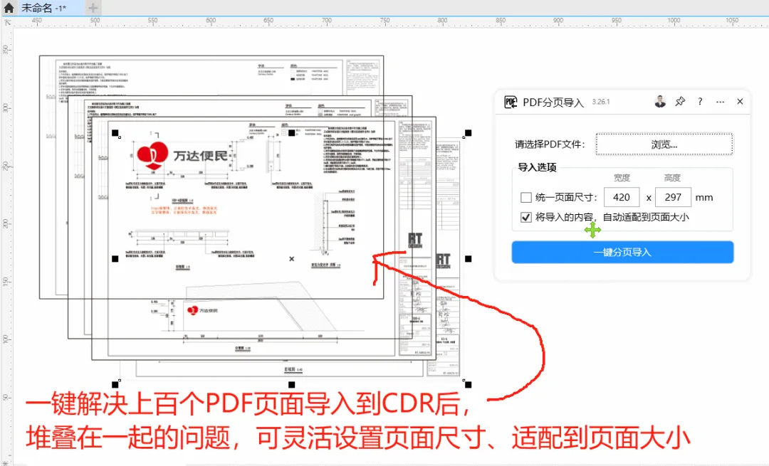 功能简介:该插件可实现批量导入PDF,将导入的内容自动排版到每个独立的页面,自动设置对象适配页面大小,同时可解决PDF导入后所有内容重叠在一起的问题。