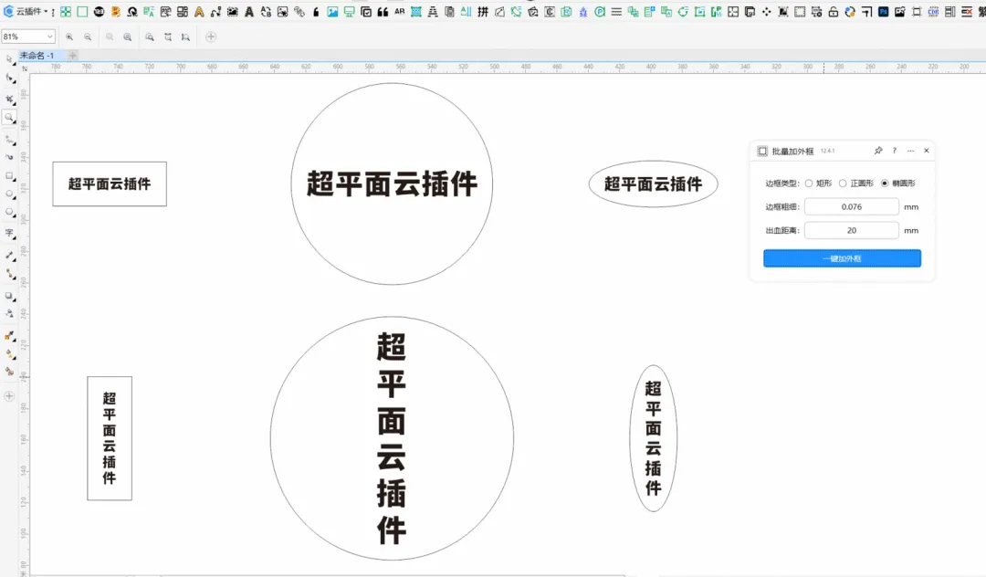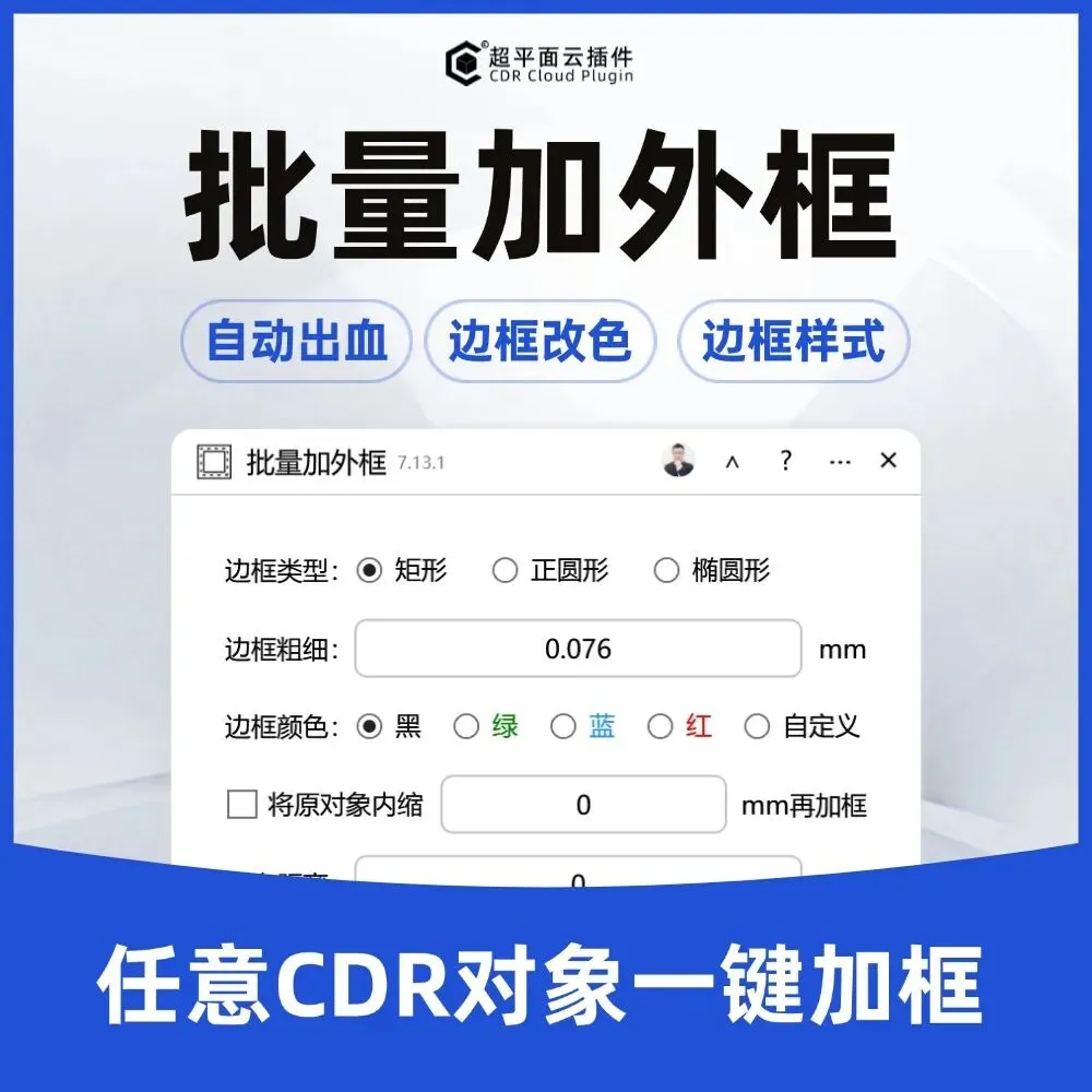 功能简介:该插件可实现给选定的图形对象批量添加矩形、正圆形、椭圆形外框(批量加边框),可指定边框的粗细和出血距离,支持边框颜色、样式定义,支持给边框取名、置入图框和群组等功能。