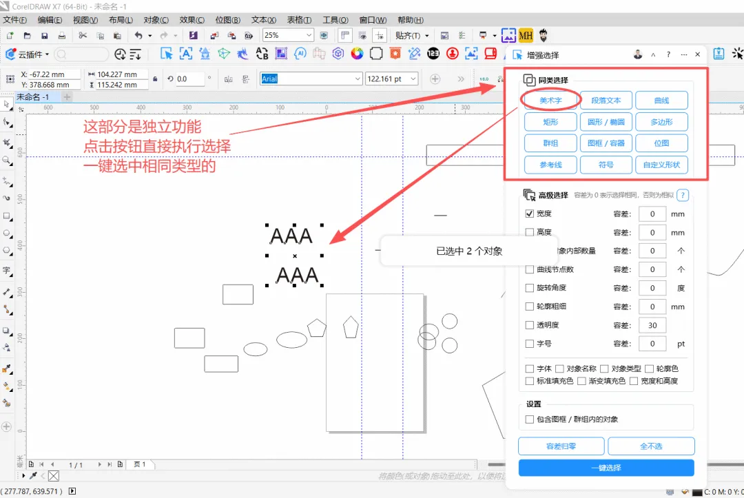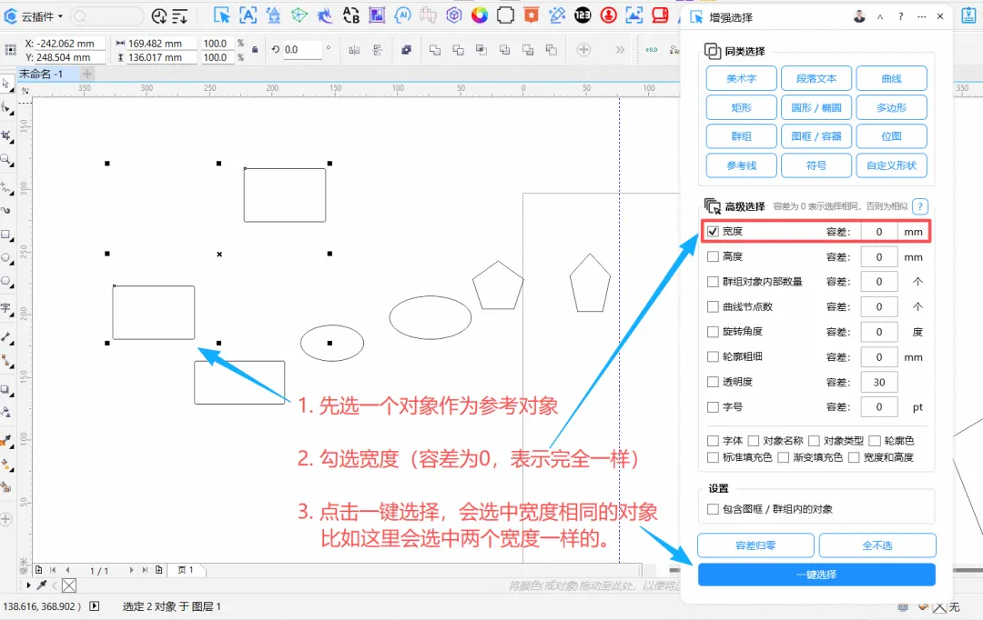 功能简介:该插件作为增强选择功能,可选中同类对象,也可选中和参考对象参考对象相同的其他对象,支持选中图框和群组内部对象,可配置容差值,实现选择相似或相同的对象。
