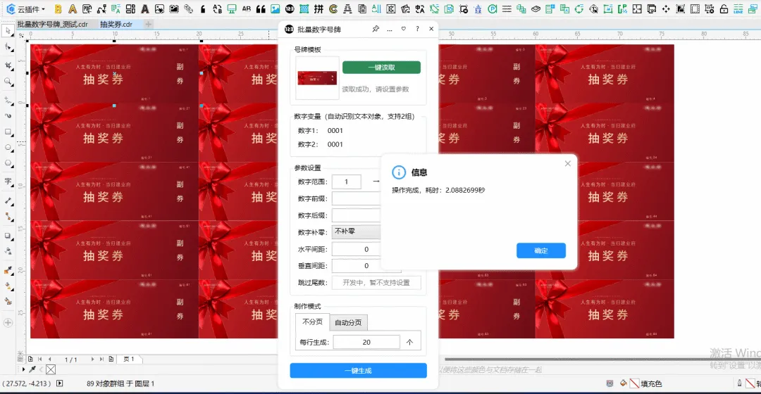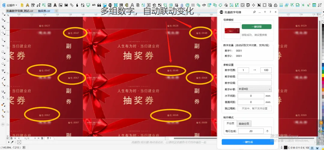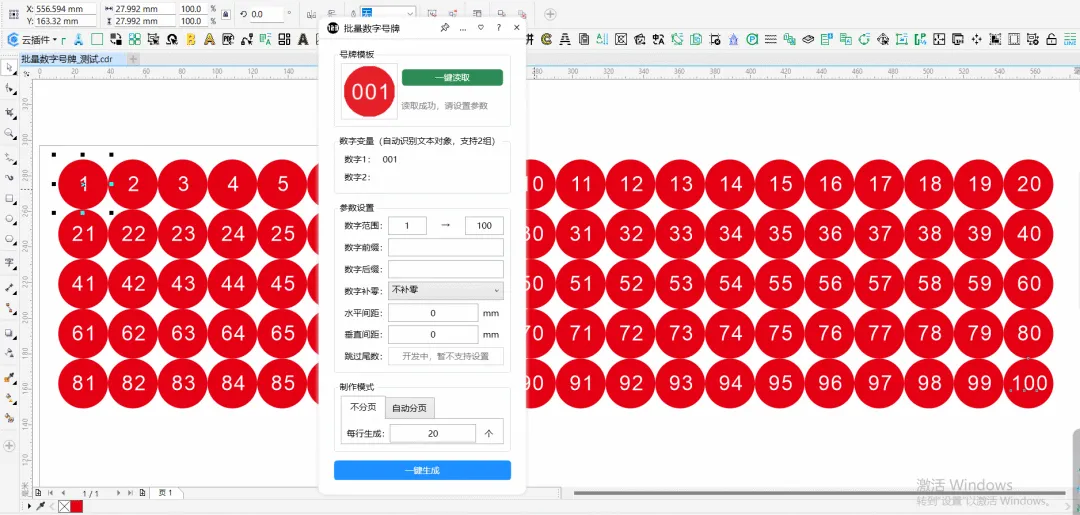 功能简介:该插件可实现快速批量复制,同时可实现数字号码自动增加,可用于制作批量号牌等场景,极大程度减少人工操作需要的时间。