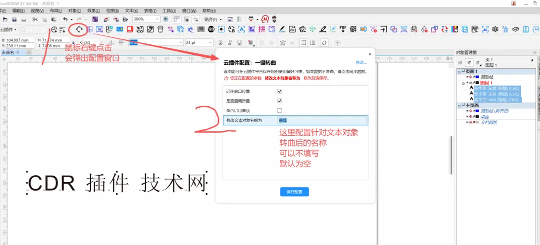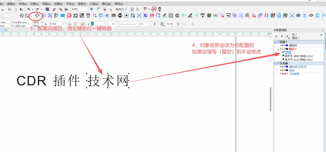 功能简介:该插件可一键将页面中的未转曲对象进行转曲,支持多级图框对象内部的对象。
