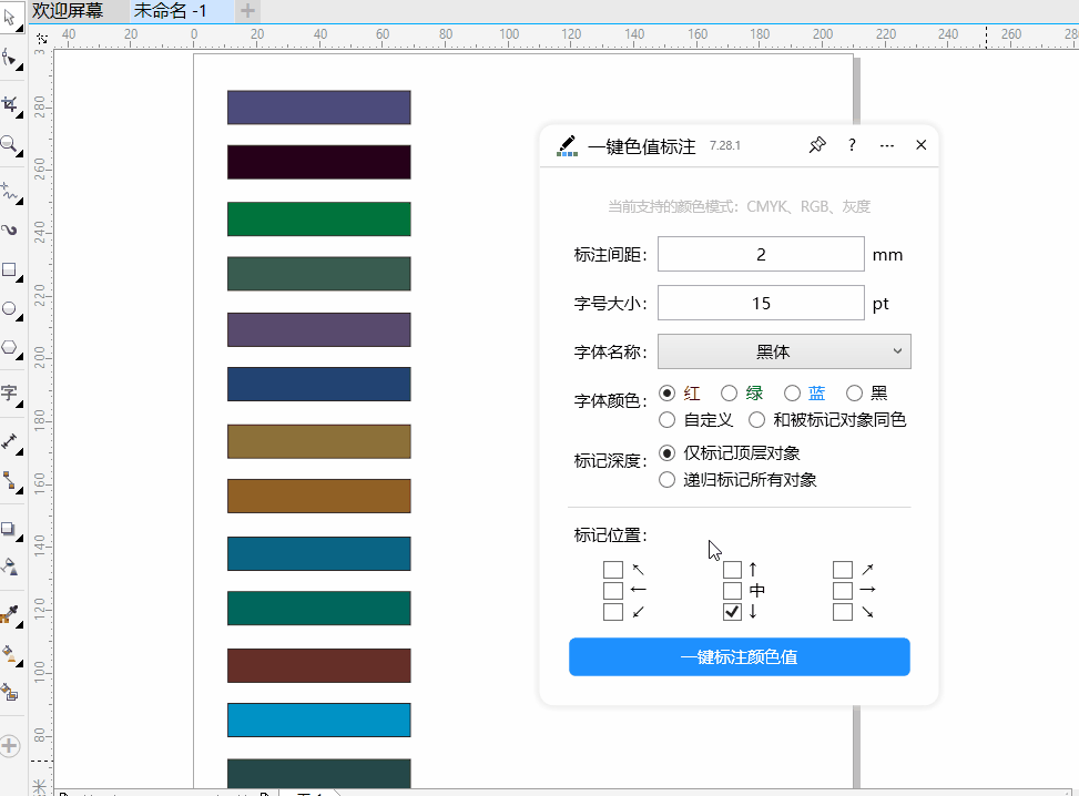 功能简介:该插件可实现快速标记所选对象颜色的色值(支持CMYK、RGB、灰度等颜色)。