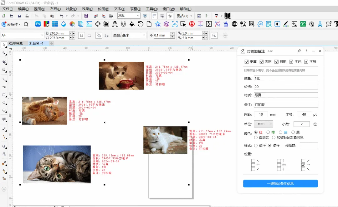 功能简介:对象加备注插件可实现给选定的对象快速添加备注信息,包括尺寸、面积、日期、字体、字号、客户、数量、价格、材质、备注等,支持单行或多行样式,支持在画面内、画面外添加标注,是否旋转等,可以自由设置多个方向的备注信息,并且可灵活设置字体、间距、字号、单位、颜色等,方便用户进行个性化标记和管理。