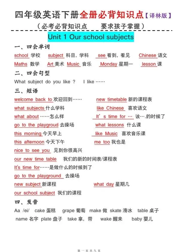 今日分享四年级下册译林版英语全册必背知识点(完整电子版可打印)!高清电子版可直接打印,排版规整适配练习,不用费心整理,孩子每日一练夯实基础,家长辅导省心!