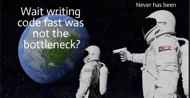 去年,凭感觉编程在非技术圈迅速流行,很多人很快就发现:就算用了超级 AI 来生成代码,要构建一个真正能用的软件其实很难。半年前,我在 LinkedIn 上做了一张关于这个话题的 meme[18]: