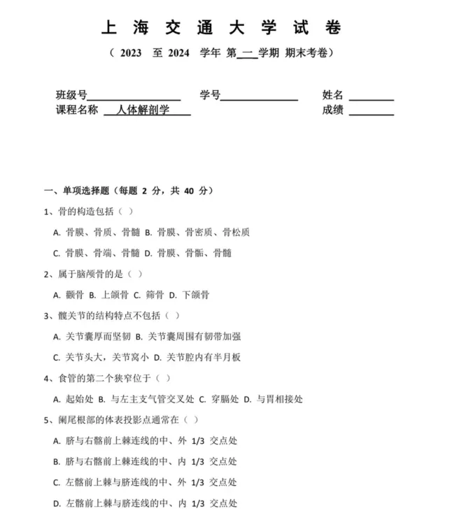 上海交通大学人体解剖学期末试题,可打印 获取更多考研资料可加小编QQ:3542263029或者v信kyzlfx 先点“赞+在看”联系客服即可免费赠送公共课(政治英语数学)资料 其他院校陆续更新中…….有需要联系客服留言即可 更多真题资料会第一时间为大家推送 还有其他年份,可联系客服详询 01 部分截图如下🔥 温馨服务 免责申明:资料整理于网络如有侵权请告知删除 长按并识别下方二维码关注公众号,不定时发放考研福利哦 扫一扫添加微信好友,获取更多考研信息哦~