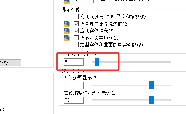 步骤五:用鼠标拖动滚动条,或者直接输入数字的大小,拖动时左边的数字也跟着变化。数字的大小反映的是十字光标的大小,数字越大表明十字光标大。