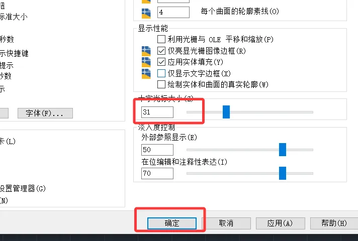 步骤四:点击上面的显示标签,在右下角我们可以看到这样的内容:十字光标大小。这便是调整光标大小的地方。