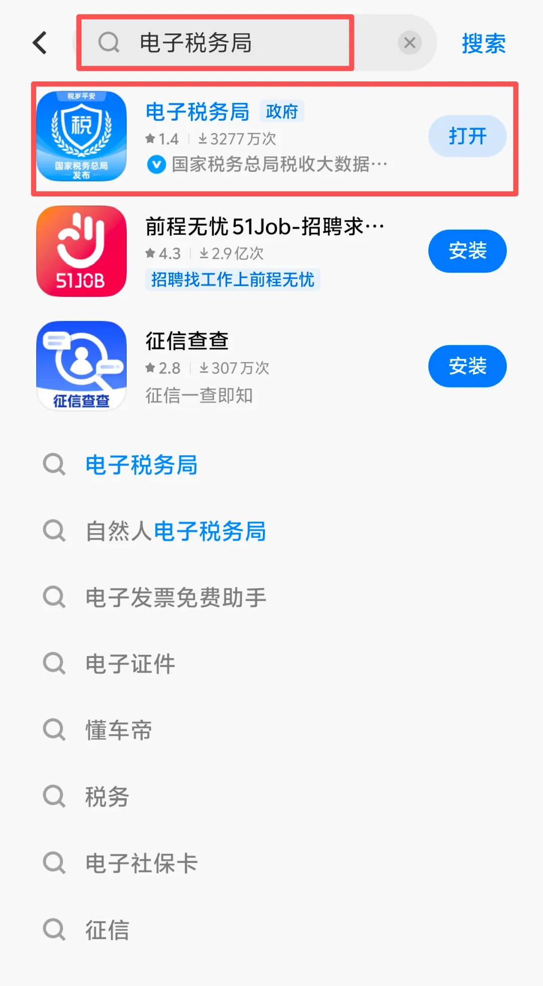 操作要点:在各应用市场搜索栏,输入“电子税务局”,认准官方APP图标(避免下载仿冒软件),点击安装,安装完成后进入下一步操作。