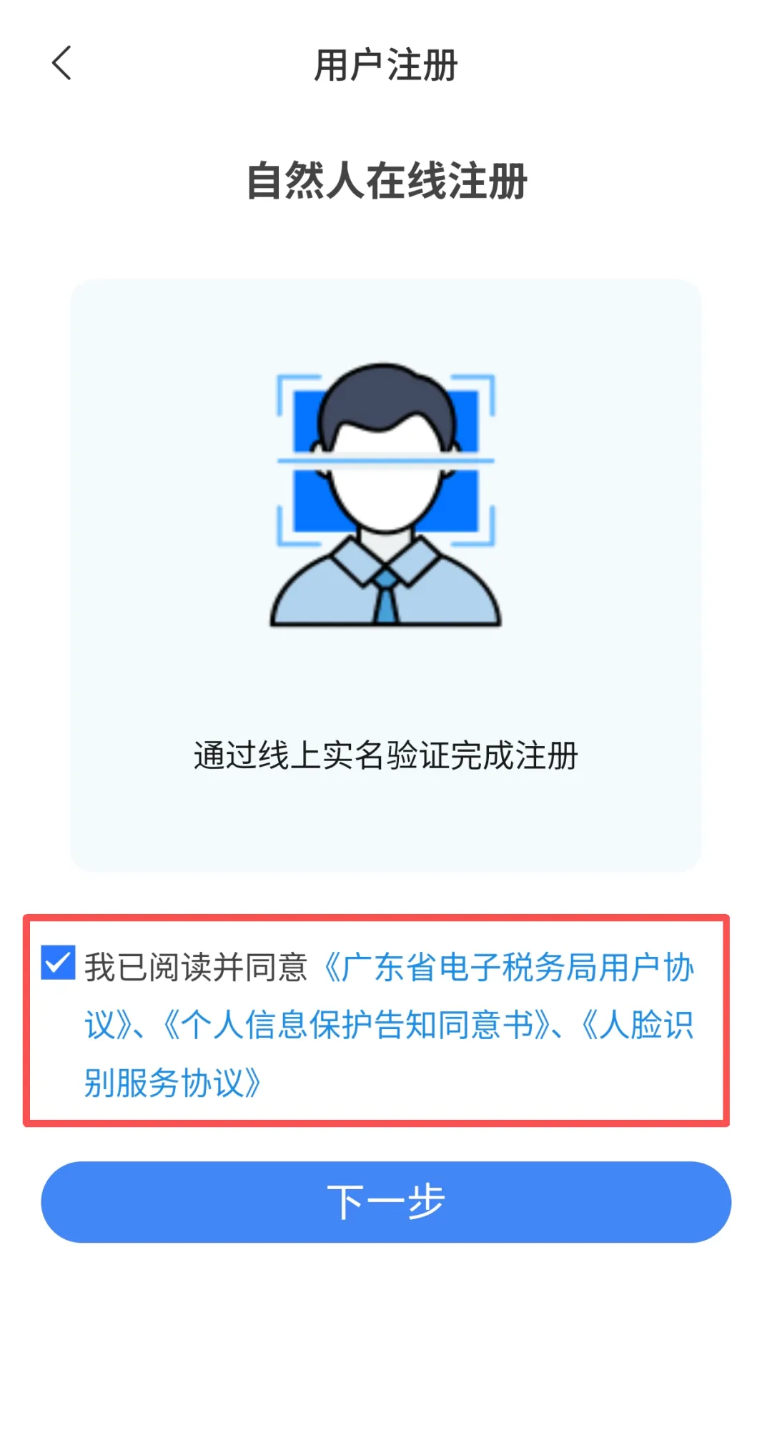 在“用户注册”界面,勾选 “阅读并同意《个人信息保护告知同意书》和《人脸识别服务协议》”,点击【下一步】。