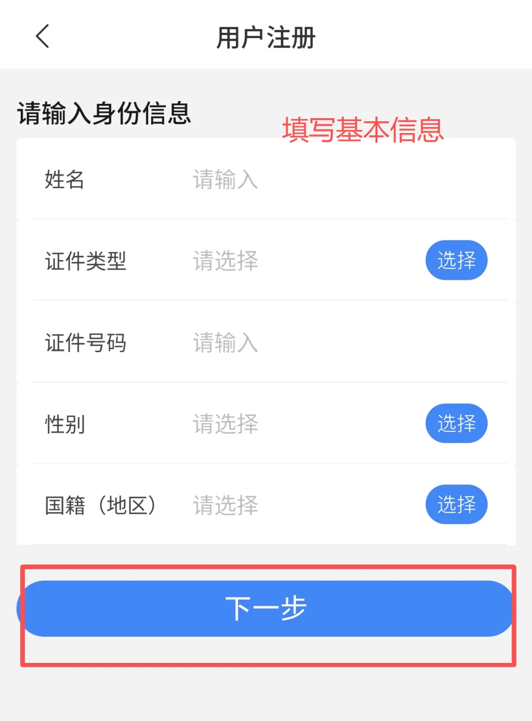 准确输入姓名、证件类型(默认身份证)、证件号码等个人身份信息,核对无误后,点击【下一步】。