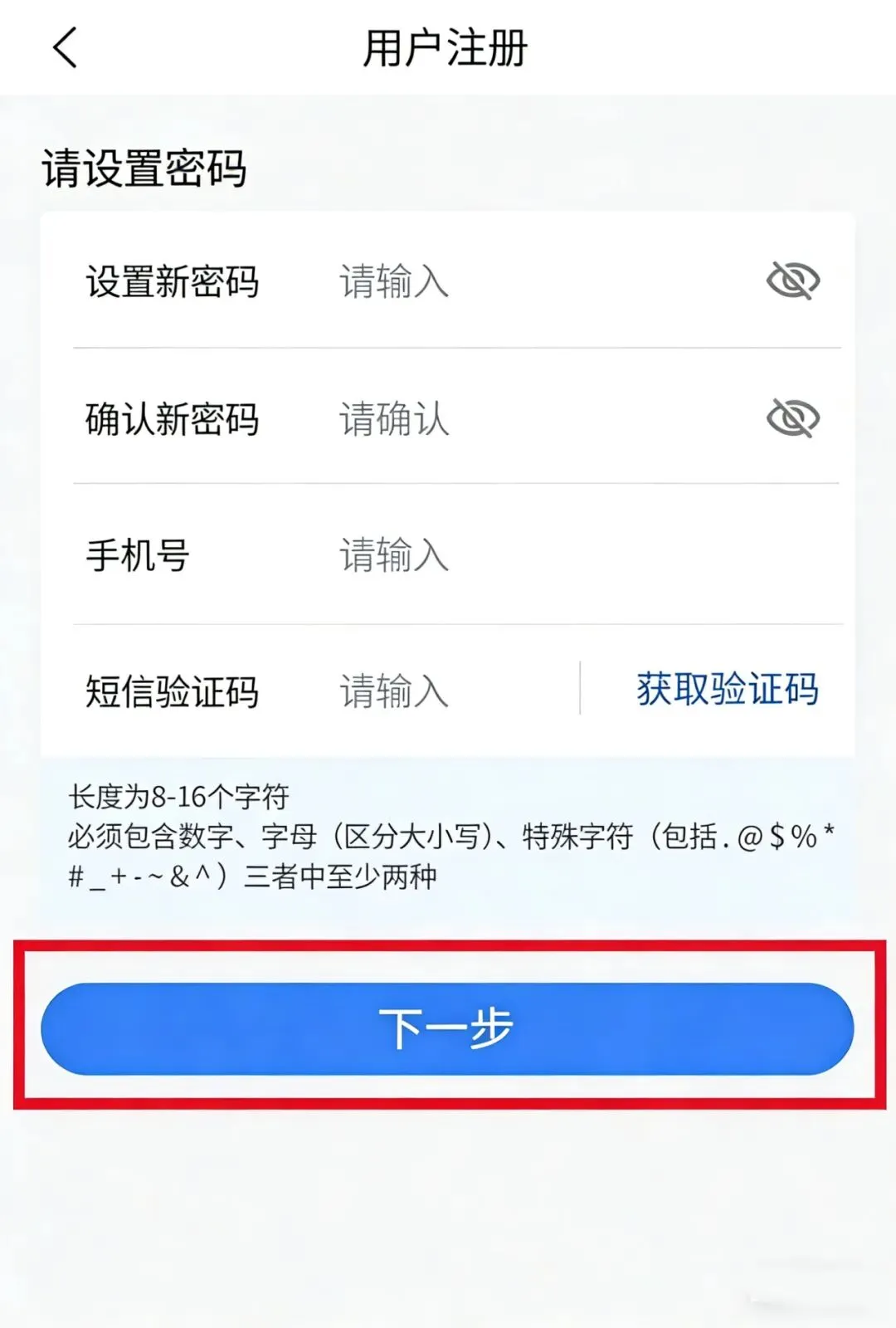 设置8-16位登录密码(重点提醒:必须包含数字、字母(区分大小写)、特殊字符(.@$%#_+–&^等)三者中至少两种),输入本人实名手机号,点击【获取验证码】,输入收到的短信验证码后,点击【下一步】。