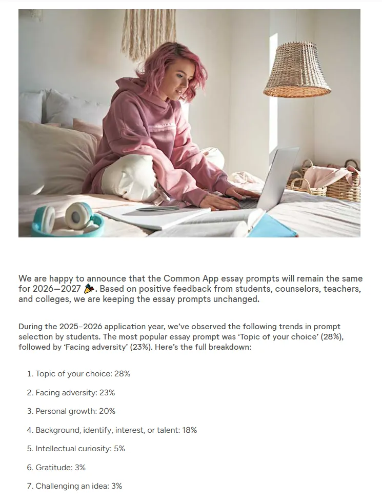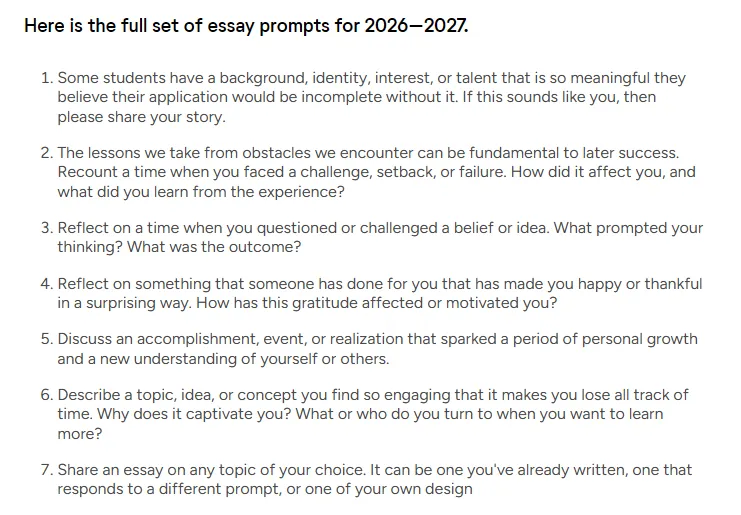 Common App(简称CA)已经宣布2026-2027申请季的主文书题目和去年一样,保持不变。为申请者提供了七个多样化的选项,涵盖个人特质、挫折成长、思辨能力、感恩共情、求知热情等多个维度,旨在全面展现申请者的综合素质。