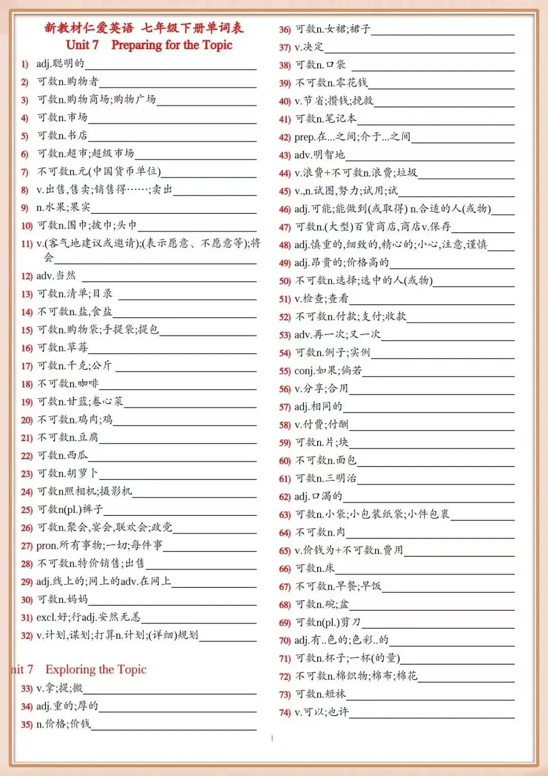 附七下英语单词表+英文默写(新仁爱版)(完整电子版可打印)
