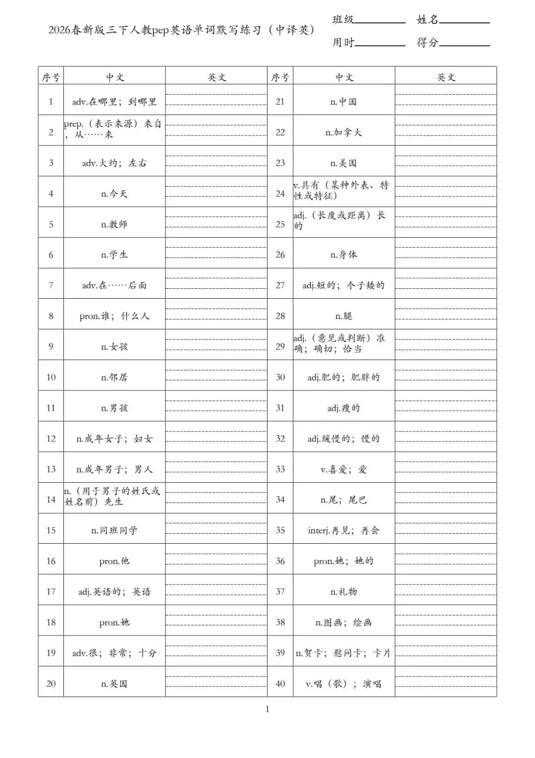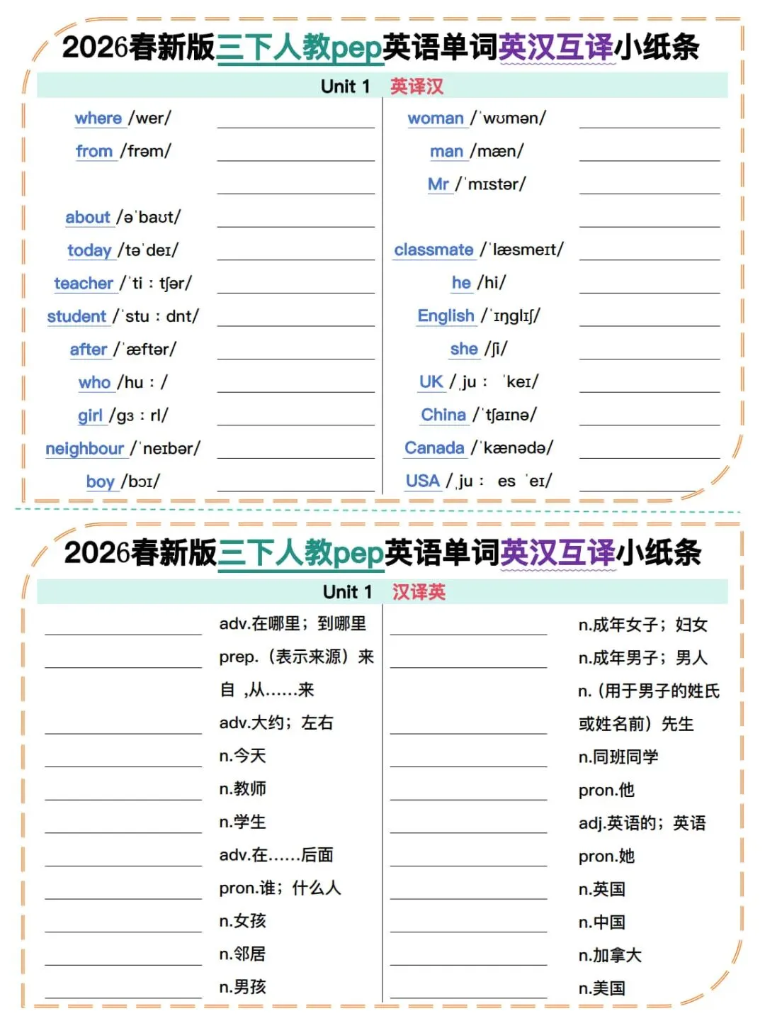 26春 人教pep版英语3-6下册《单词默写+字帖》|免费下载PDF