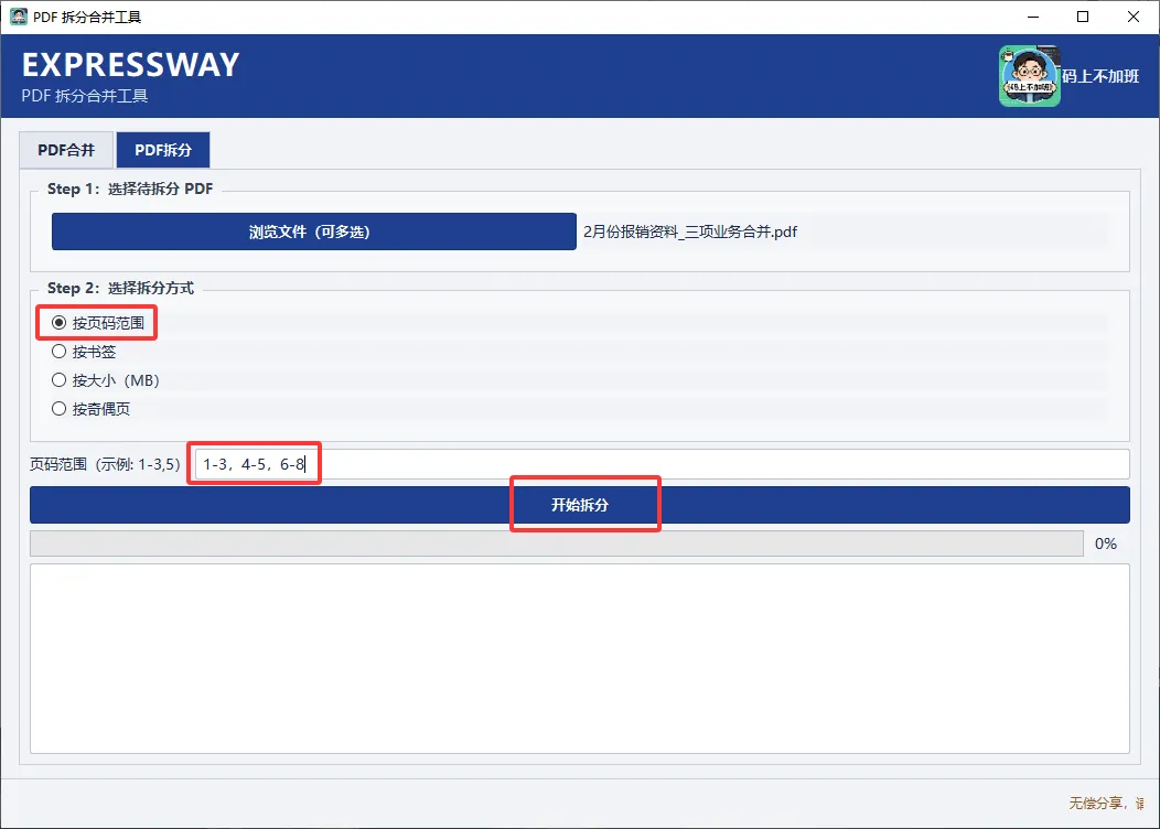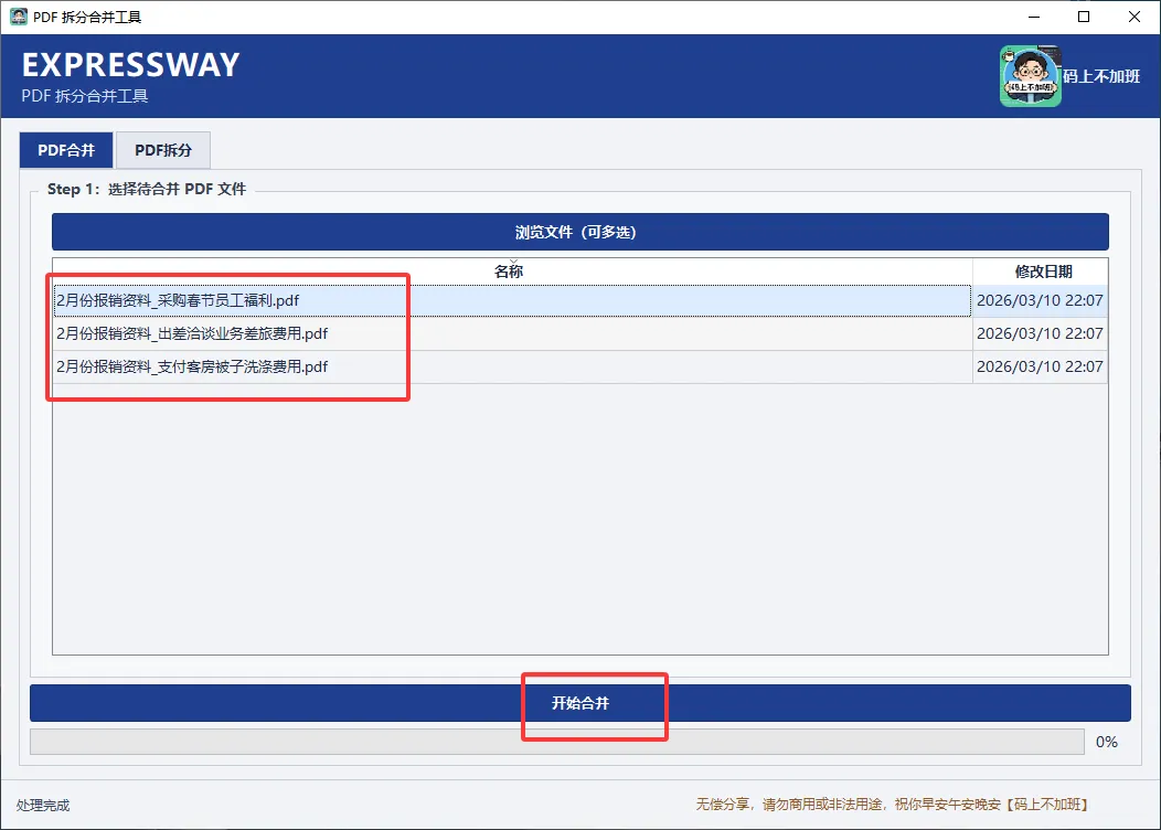 为了随时能在手机上打开查阅,小码想着把这些资料整理成一份 PDF文件,写了个“PDF拆分合并工具”。操作非常简单👇: