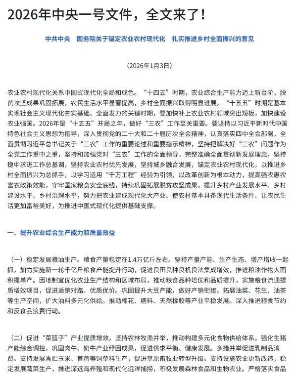 2026中央一号文件已正式发布(2月3日公布),作为党的十八大以来第14个聚焦三农的纲领性文件,现已整理好重点解读,附原文可直接下载,还含高清PDF版本!文件围绕农业农村现代化、乡村全面振兴、粮食安全等核心部署重点工作,划重点后精准提炼核心要点,不用逐字啃全文。高清PDF可一键保存、打印,适配学习、工作、科普等多种场景,不用四处零散搜集,收藏起来快速掌握核心政策