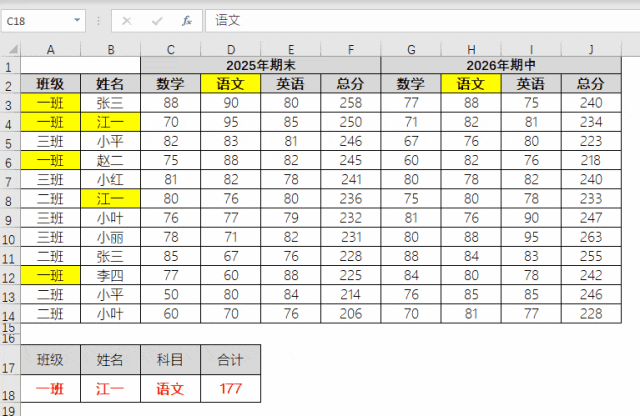 公式:=SUM((A3:A14=A18)*(B3:B14=B18)*(C2:J2=C18)*(C3:J14))
