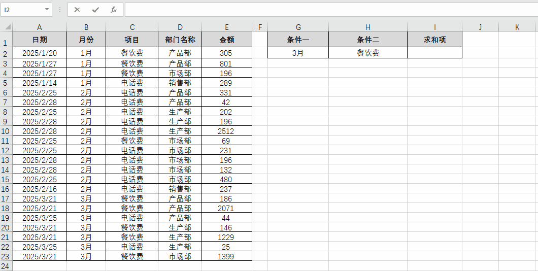 图中示例的公式:=SUMIFS(E2:E23,B2:B23,G2,C2:C23,H2)