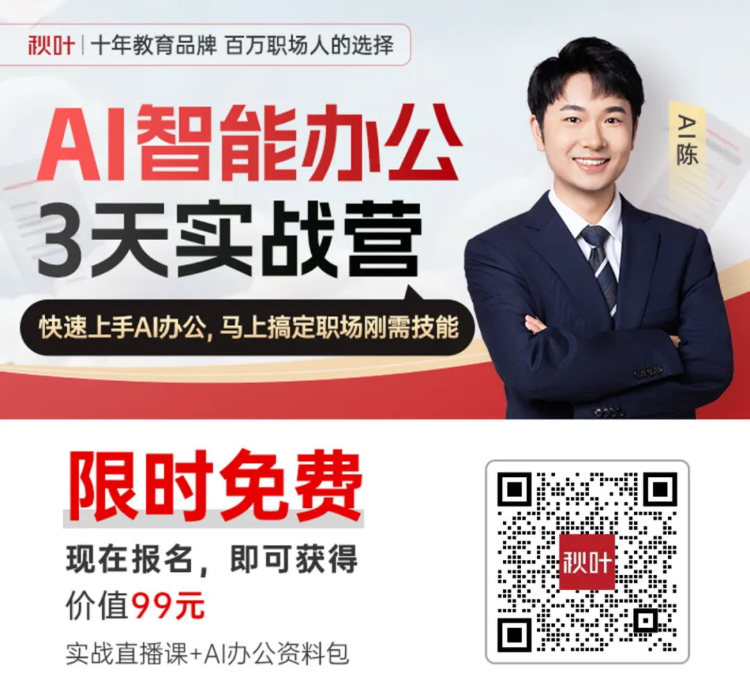 现在报名《秋叶 AI 智能办公 3 天实战营》,秋叶金牌讲师 @AI陈 会手把手教你实战技巧,帮你用更短的时间玩转 AI、实现职场进阶!