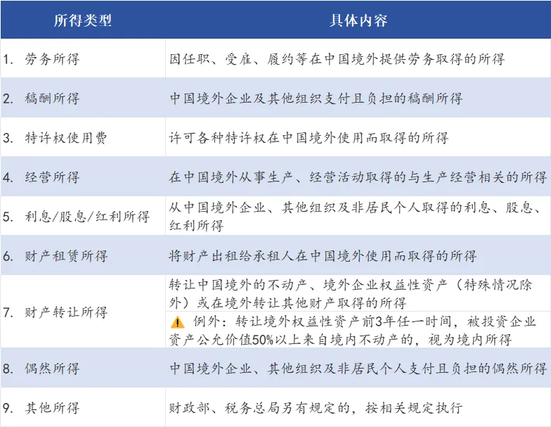 根据财政部、税务总局2020年第3号公告,以下九类均属境外所得: