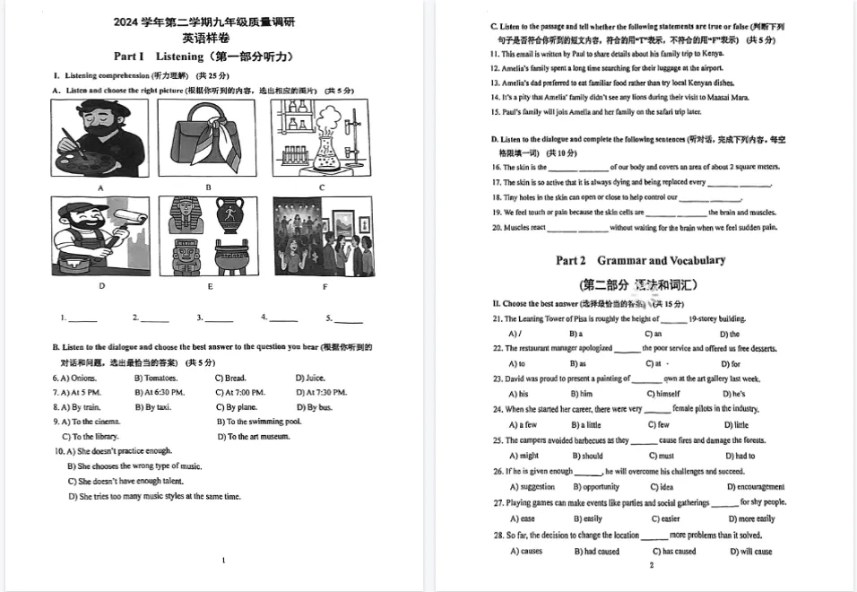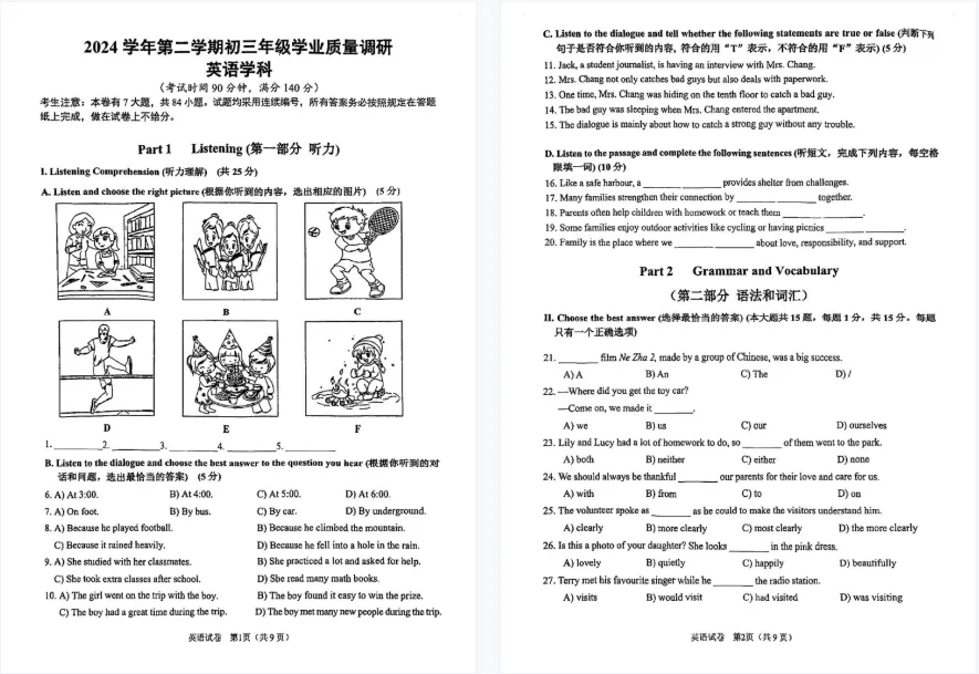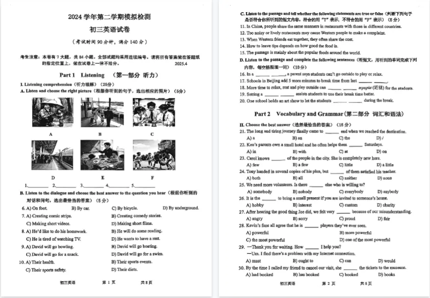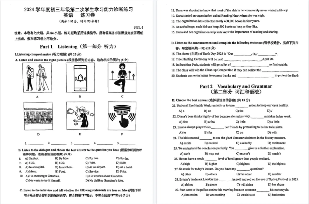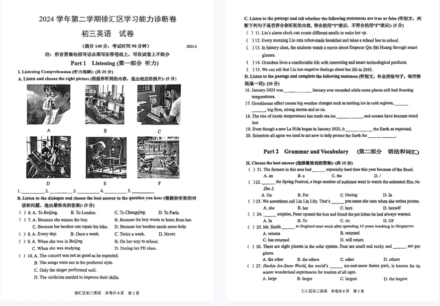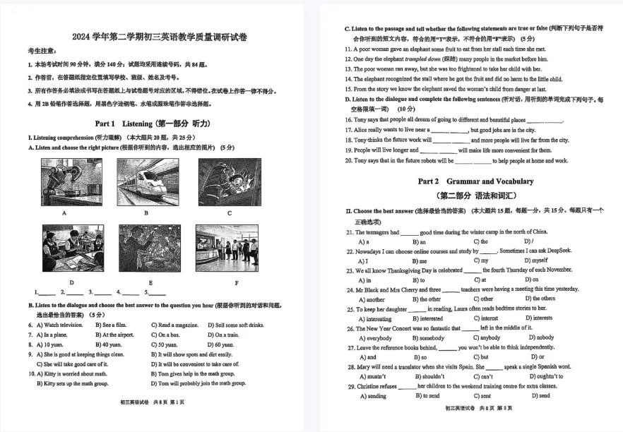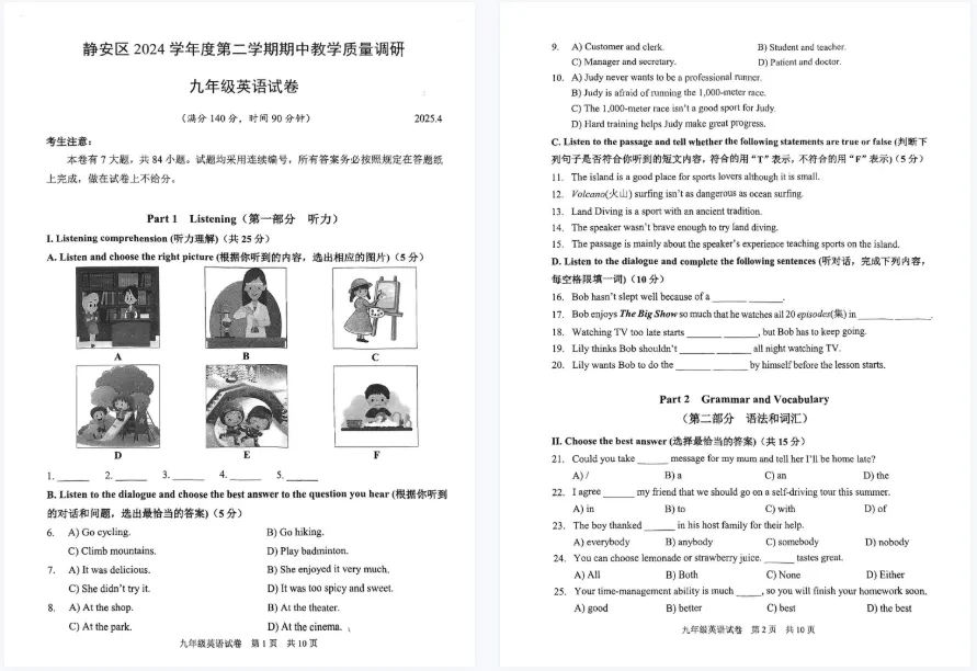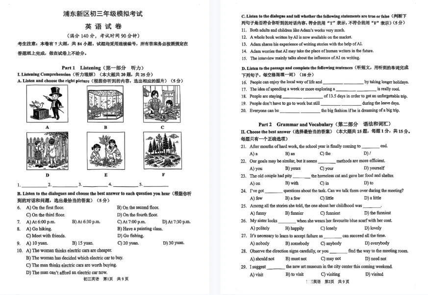 【PDF可下载】2025浦东/闵行/普陀/静安/徐汇等上海16区初三二模英语真题+答案!