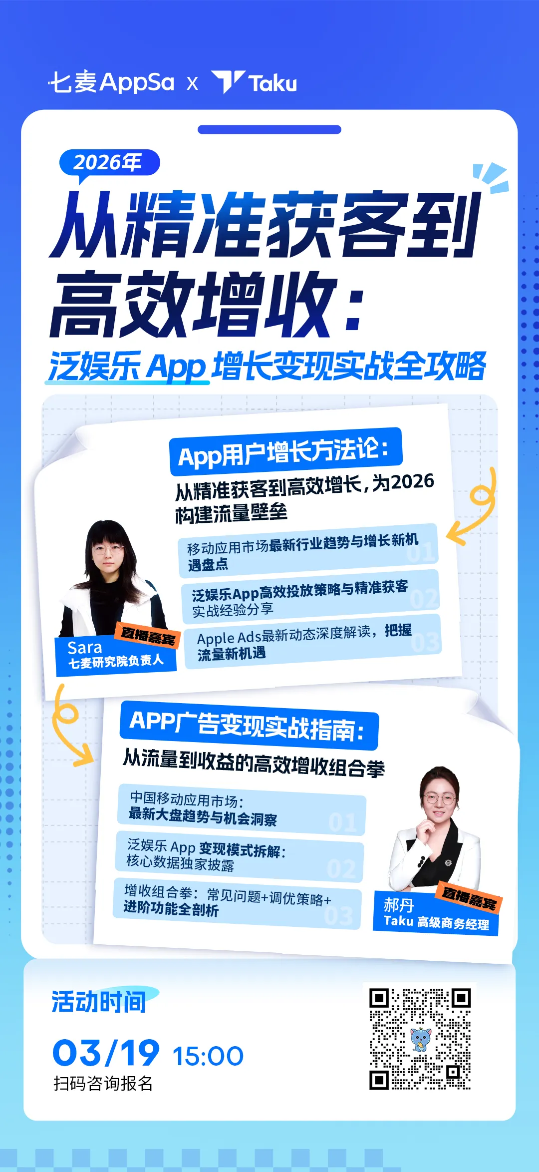 为了帮助开发者抢占2026年增长先机,七麦AppSa联合专注于App广告变现领域的Taku,共同为大家带来《从精准获客到高效增收:泛娱乐App增长变现实战全攻略》的直播分享。本次直播特邀两位行业专家联袂分享:七麦研究院负责人Sara老师将为大家带来2026年移动应用市场最新趋势与增长新机遇盘点,并详解泛娱乐App高效投放策略与精准获客实战经验等;Taku高级商务经理郝丹将深度拆解泛娱乐App变现模式,同时围绕App广告变现中的常见问题与调优策略等,为大家带来一套从流量到收益的高效增收组合拳。