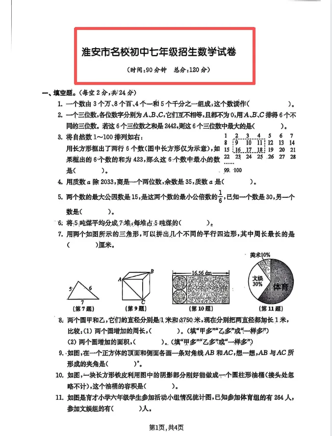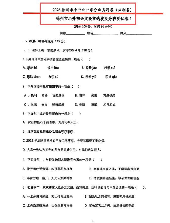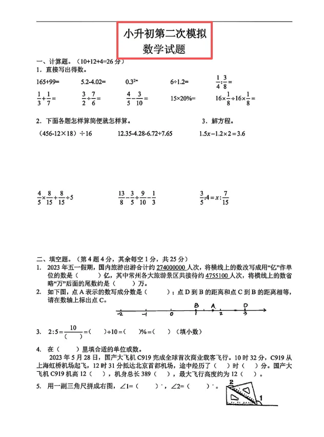 江苏省六年级小升初模拟卷分班卷(电子版可打印)