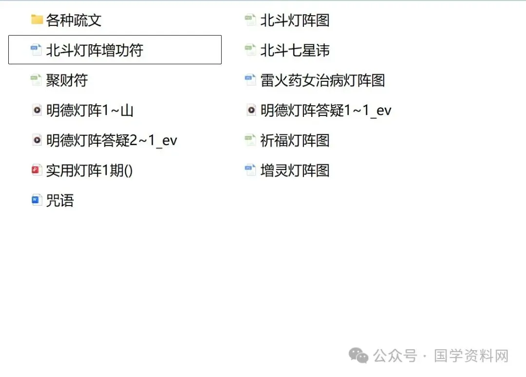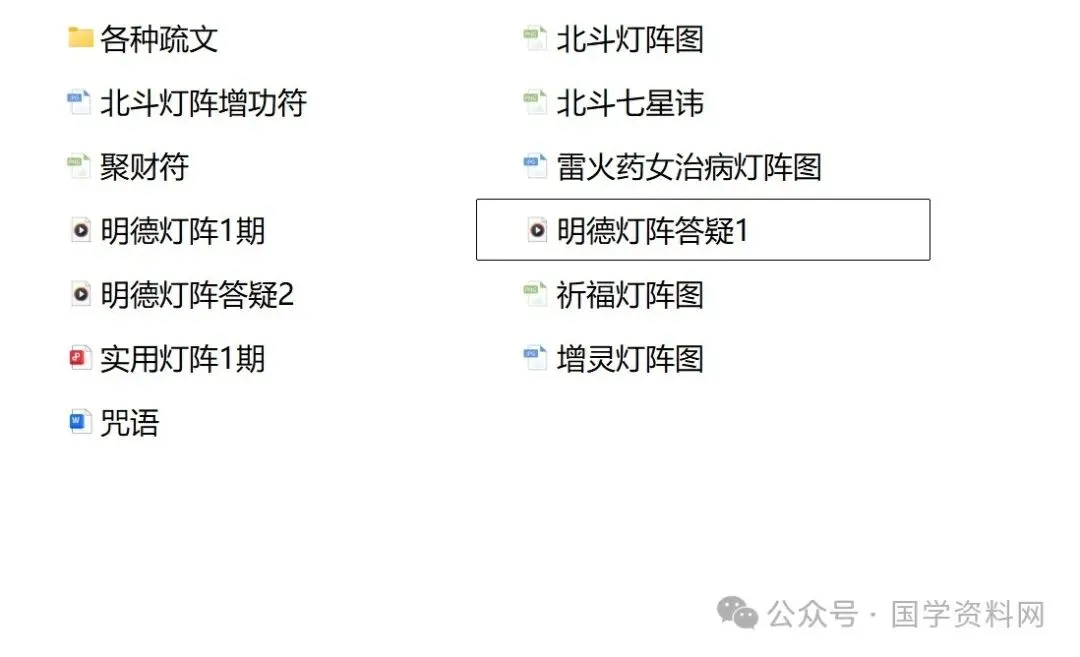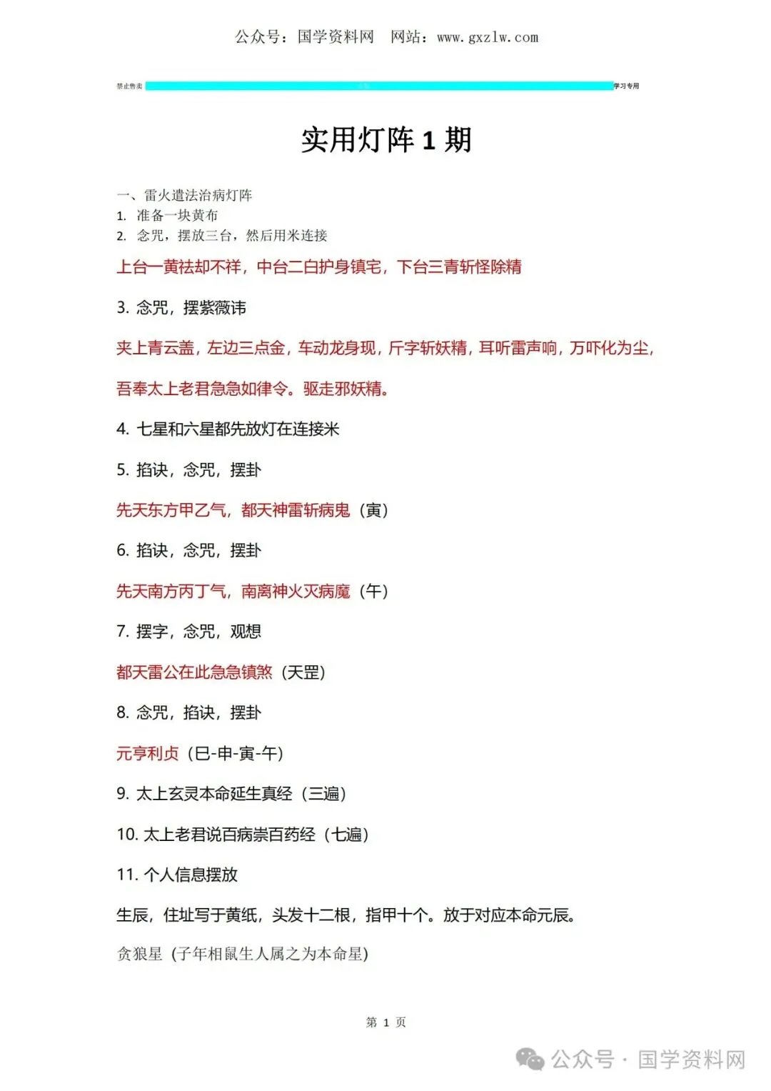 实用灯阵一期一、雷火遣法治病灯阵此阵具有调理身体,治病救人之功效。1.对应灯咒启用三台、北斗、南斗之力2.对应米咒3.融入雷火之气4.观讳5.真对每个人摆放等位在哪儿6.太上老君说百病崇百药经7.太上玄灵北斗本命延生真经二、雷火药吕治病灯阵对比雷火遣法灯阵,这个灯阵相对于摆放更加简单,程序也没有那么复杂,但是效果也不会减少。三、增灵灯阵1.增加整个房屋气场2.打坐时可摆放此灯阵3.可摆放于坛前,增加法坛能量四、北斗灯阵1.用灯阵加持符来增功于每月初一十五点灯加持2.观想与入讳的重要性3.讲解一道增功灵符4.这个阵主要是讲解如何去运用,也是一个比较广泛的阵。能用来干很多事情。五、祈福灯阵1.消灾解厄祈福镇宅2.表文3.讳字需要哪些东西混合六、聚财灯1.一道聚财符2.可以长期点于法坛,或者家中3.相对于迅猛的聚财来讲,这个聚财法更加的柔和,持久。4.靠符力,灯力的加持,来达到聚财的效果七、七星罡步1.摆灯前都可以踏七星罡来增加自身能量2.可以更好的链接祖师,通过灯阵达到我们想要的效果