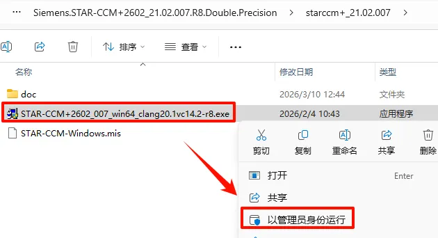 2.打开刚刚解压的文件夹,双击打开“starccm+_20.06.007”文件夹,鼠标右键点击“STAR-CCM+2602_007_win64_clang20.1vc14.2-r8.exe”选择“以管理员身份运行”