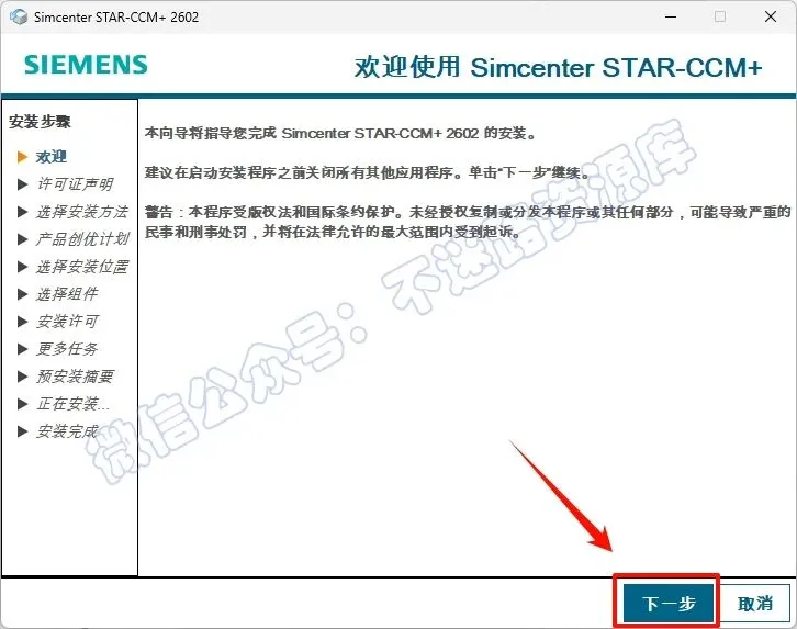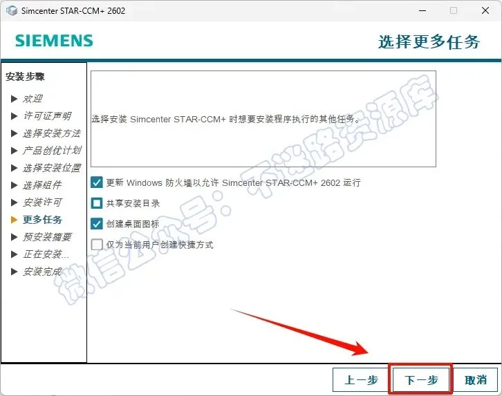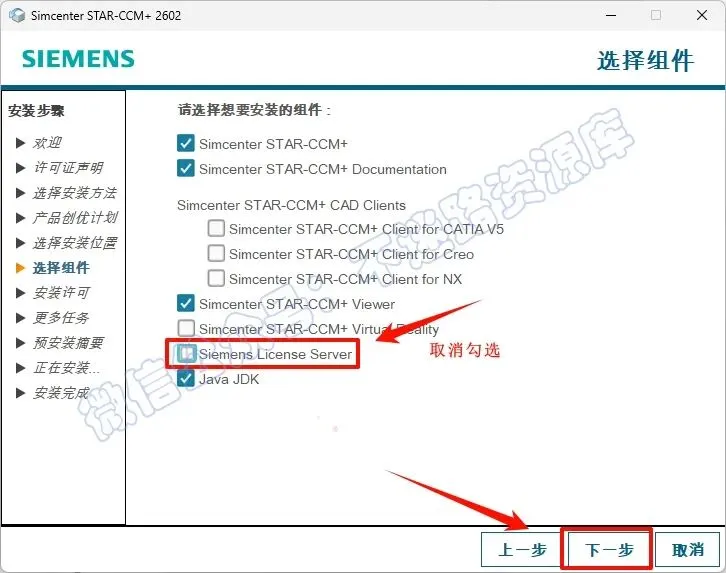10.取消勾选“Siemens License Server”(务必取消勾选,否则会安装失败),根据自己的需要选择组件;注意“Simcenter STAR-CCM+ CAD Clients”这一项,是指在所列出的CAD软件中安装一个直接向STAR-CCM+传输3D数据的插件,前提是当前电脑上已经安装了CAD软件,点击“下一步”