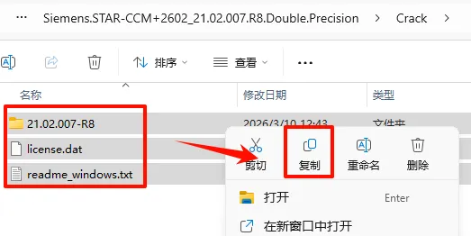 16.返回之前解压的“Siemens.STAR-CCM+2602_21.02.007.R8.Double.Precision“文件夹,双击打开“Crack”文件夹,选中该文件夹下的全部文件,鼠标右键选择“复制”