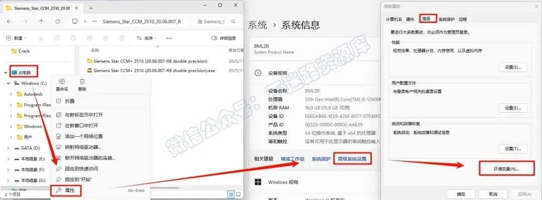 19.返回安装包,鼠标右键左侧“此电脑”选择“属性”,点击“高级系统设置”,点击“环境变量”