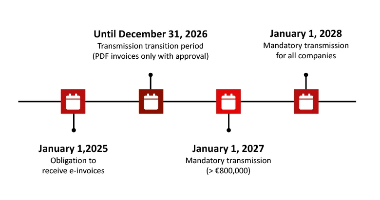 2025年1月1日起,企业必须具备接收电子发票的能力。→ 2026年12月31日之前是过渡期(企业仍可在德国境内 B2B 交易中开具“其他发票格式”。纸质发票仍被允许;PDF 发票则需经收票方同意。)→ 2027年1月1日起强制实施(上一财年营业额不超过80万欧元的小型企业,其过渡期延长至2027年底。)→ 2028年1月1日起所有企业强制实施电子发票